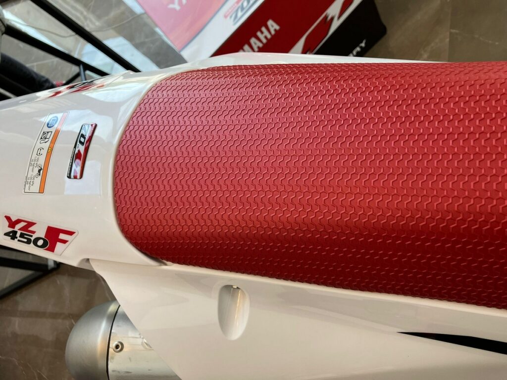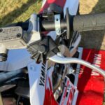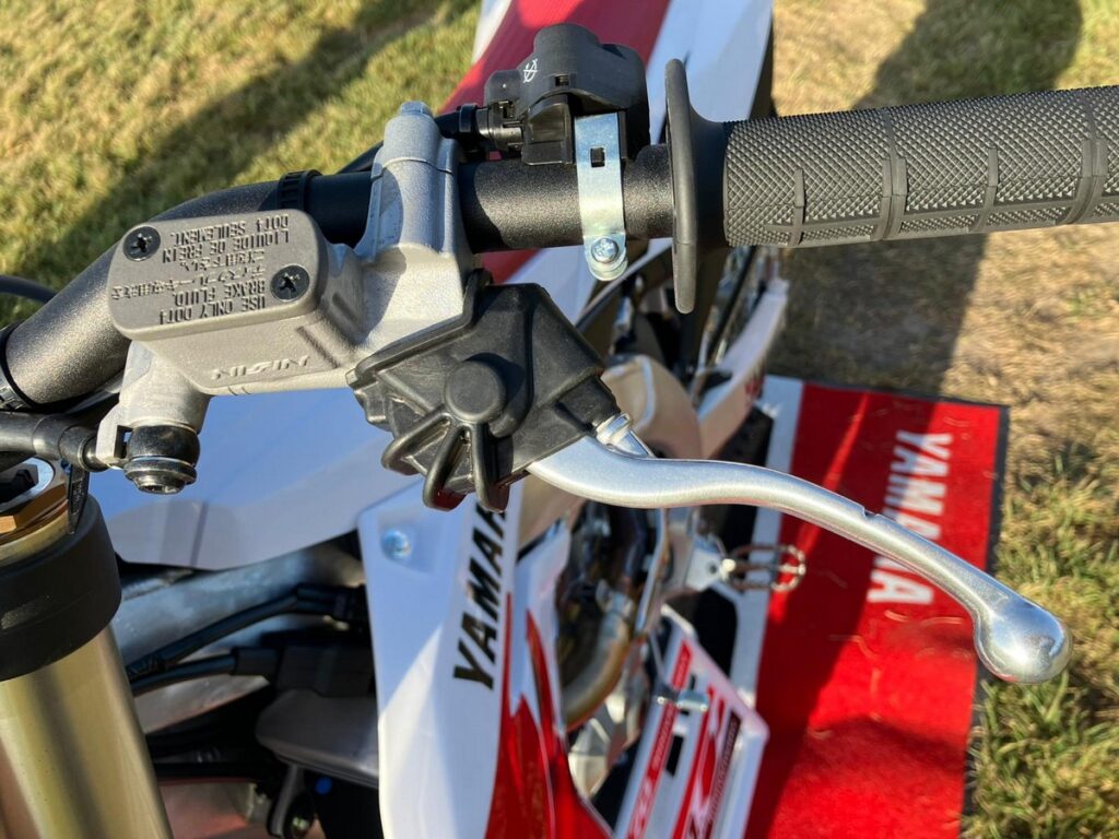Finally, it was time for the big dog ,the 70th anniversary YZF450 Yamaha in the retro white. To be fair, it does look sweet . The bike has had some pretty major and minor tweaks, starting with a different inlet port to help with the performance for a smoother delivery, which felt pretty good. Although in the test I tried different mapping and found the bike easier to ride with the mapping on an aggressive setting, as with the more mellow setting, it was a bit too mellow coming out of the turns, which almost gave it a slight delay of power, which might work better for a less experienced pilot. As I have just mentioned, there are different mapping settings on the handlebars, although you can tweak these now with the new app and Bluetooth them to your bike. But with all this technology, I must say the most impressive thing is that now you can finally set a password to activate or deactivate your CDI, which means if stolen, this bike can not be started, a big tick in the box from me .