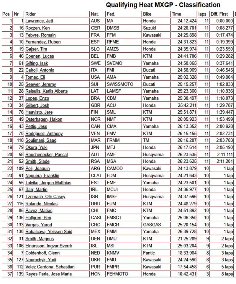 Jett Lawrence claimed victory in the MXGP qualifying heat at the Motocross of Nations in the United States. The Australian rider held off a strong charge from Ken Roczen throughout the entire race to take the win, with Romain Febvre finishing third.