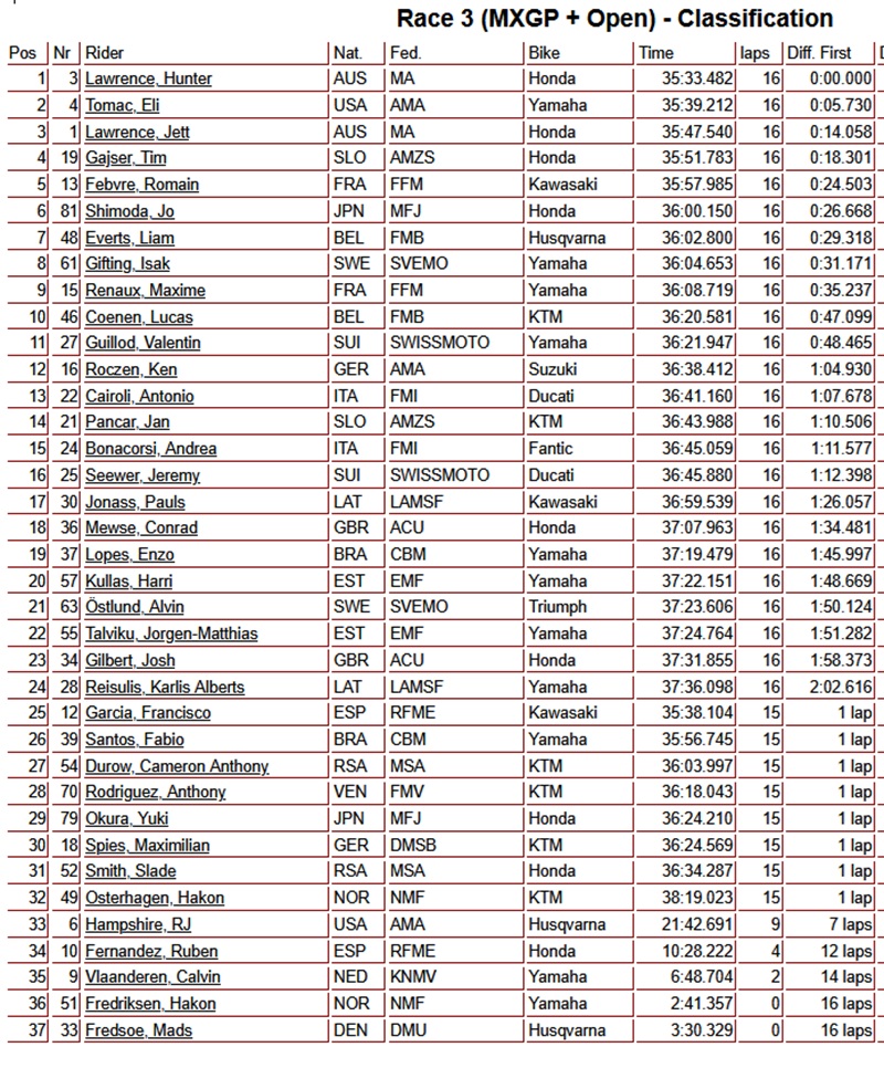 Behind the unstoppable Hunter Lawrence, Eli Tomac finished second, followed by Jett Lawrence in third. Tim Gajser and Romain Febvre completed the top five.