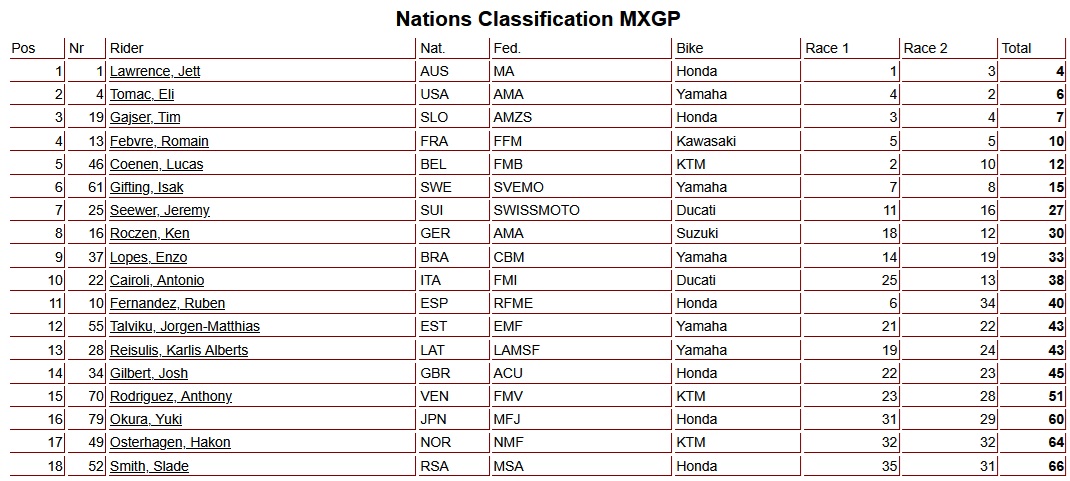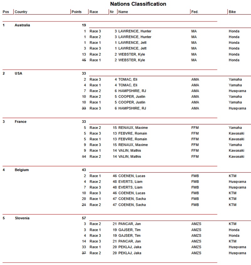 Hunter Lawrence wrapped up the 78th edition of the Monster Energy FIM Motocross of Nations in perfect style by winning his second race of the day. With Australia taking victory in all three motos, the reigning champions successfully defended their title and once again lifted the prestigious Chamberlain Trophy.