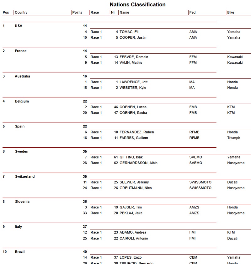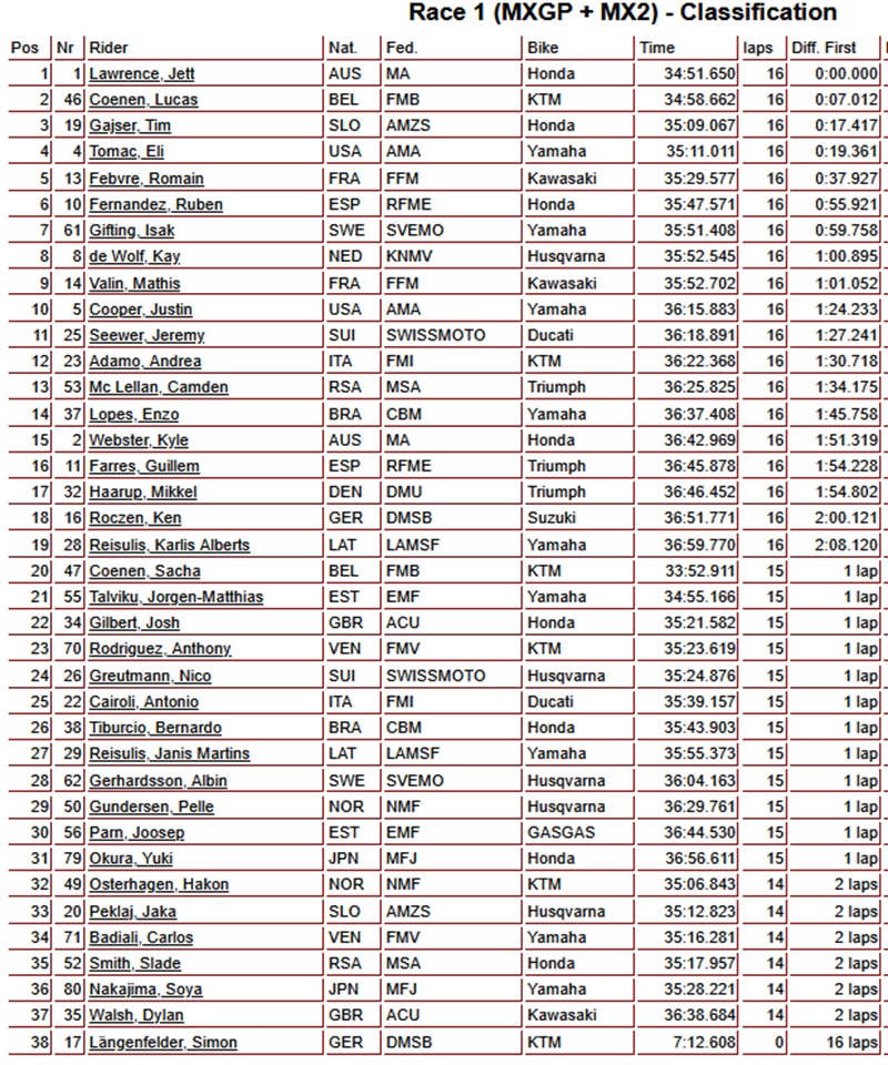 The race began with drama for Team Germany as both Ken Roczen and Simon Längenfelder crashed in the first corner. Längenfelder was unable to continue, while Roczen recovered only to 19th position. At the front, Jett Lawrence dominated from start to finish, taking a commanding win ahead of Lucas Coenen in second and Tim Gajser in third. Eli Tomac and Romain Febvre completed the top five.