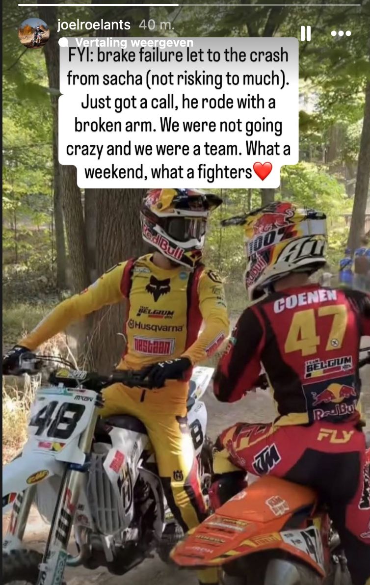 That Sacha Coenen possesses an impressive amount of determination is something we already knew. This past weekend, he was selected to represent Team Belgium at the MX of Nations in the United States. He managed to win the qualifying heat in the MX2 class and was riding strongly at the front in the first moto until, in the final lap, he ran into an issue with his rear brake. This caused him to crash, after which he was hit by Justin Cooper. As a result, Coenen sustained a fracture in his arm.