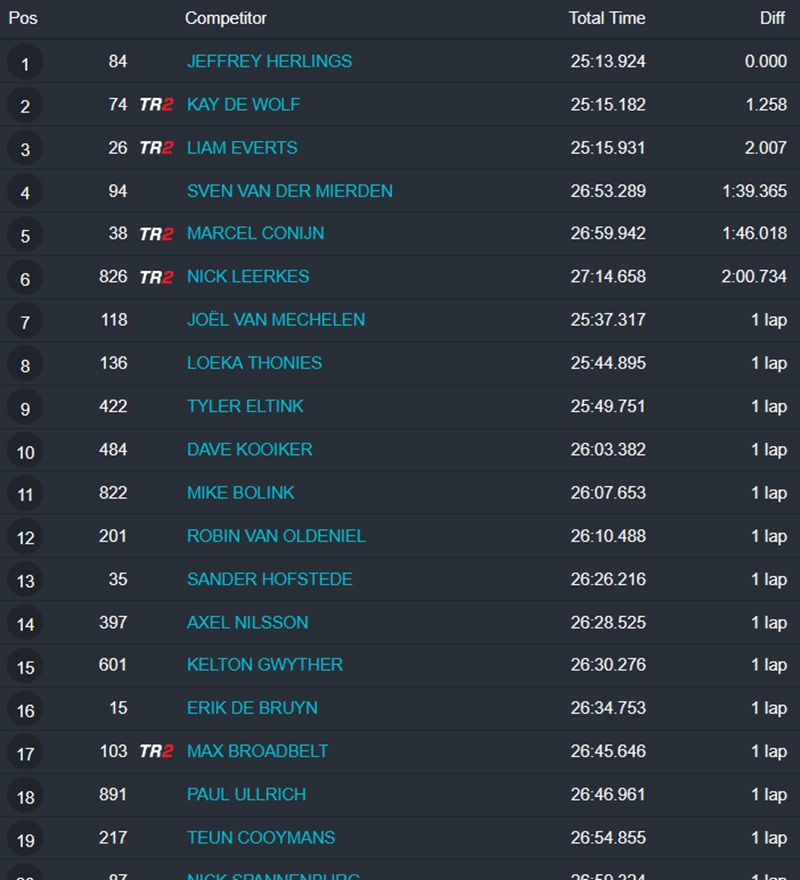 Far behind the top three, Sven van der Mierden finished fourth, ahead of Marcel Conijn in fifth place.
