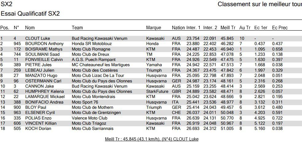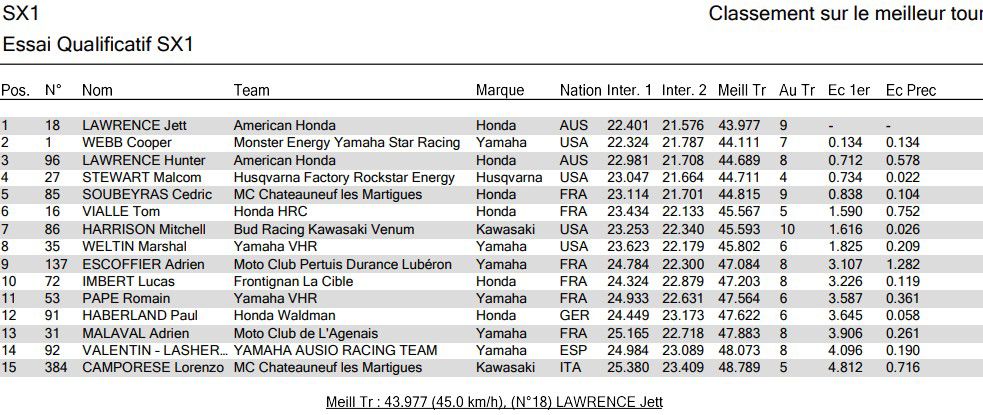 Jett Lawrence and Luke Clout set the fastest times in the timed practice session of the Supercross in Paris. In the 450 class, Cooper Webb qualified second ahead of Hunter Lawrence. Behind Clout, Anthony Bourdon recorded the second-fastest time in the 250 class, ahead of Mathys Boisrame.