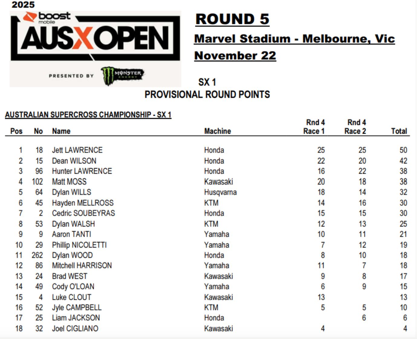 Jett Lawrence has won the Australian Supercross Open in Melbourne. Lawrence took control of both main events and dominated the race. Behind Lawrence, Dean Wilson secured second overall with a 2–3, ahead of Hunter Lawrence with a 5–2. Hunter came from the back of the pack in the first main event and still managed to salvage a fifth place.