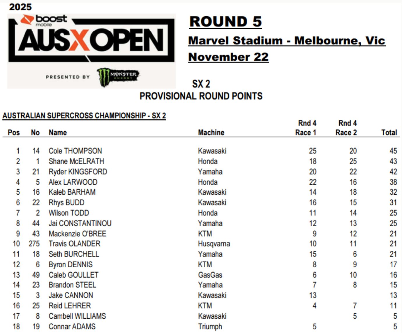 In the SX2 class, the victory went to Cole Thompson with a 1–3, ahead of Shane McElrath with a 4–1 and Ryder Kingsford with a 3–2. The latter now leads the SX2 standings in the Australian Supercross Championship after Lux Turner was injured during practice and has most likely suffered a fracture in his wrist/arm.