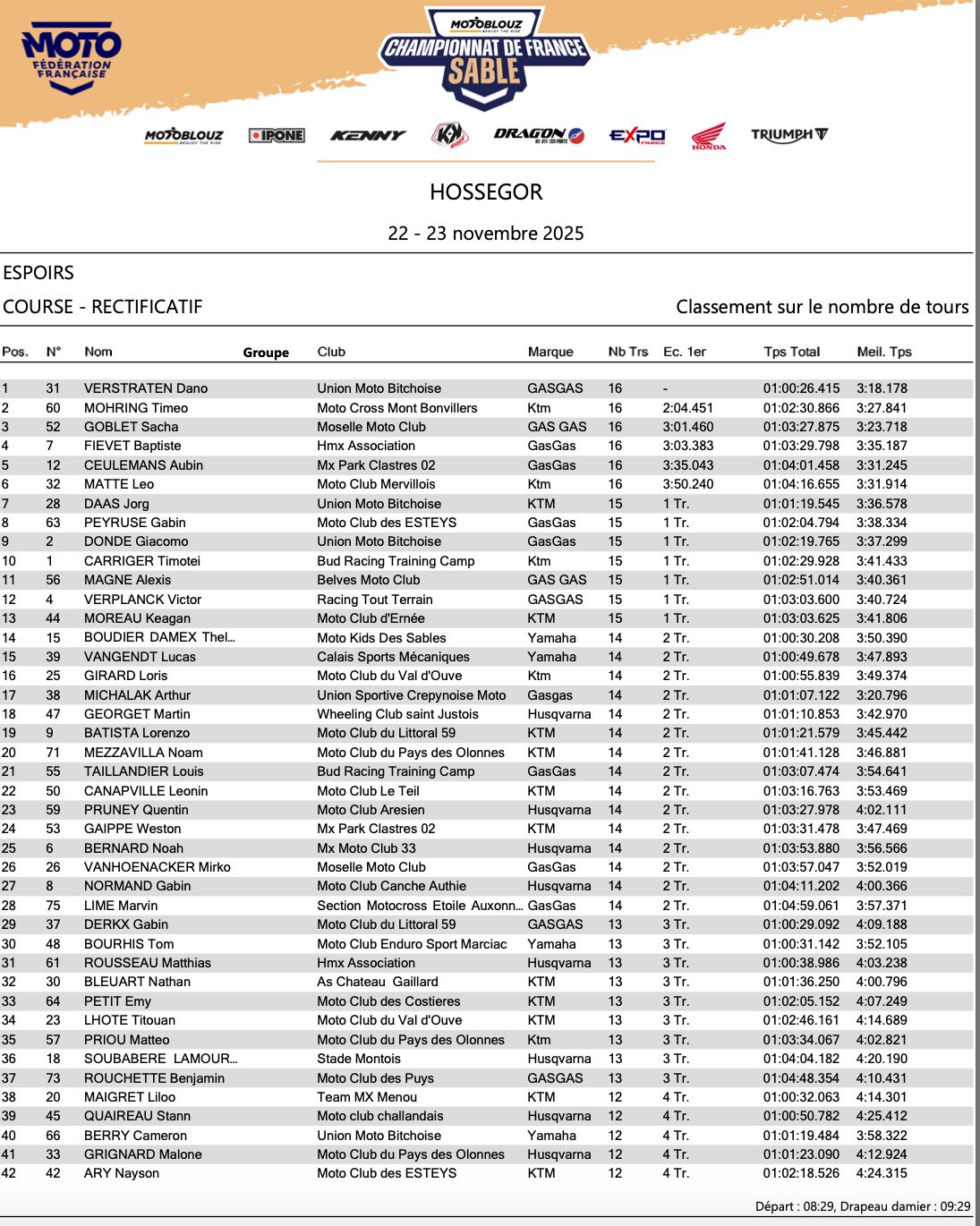 Dano Verstraeten delivered a strong performance in the French Sand Championship 85cc in Hossegor. In the 1-hour race, Verstraeten managed to build a lead of more than two minutes over second-placed Timeo Mohring. Behind Verstraeten and Mohring, Sacha Goblet finished third ahead of Baptiste Fievet and Aubin Ceulemans.