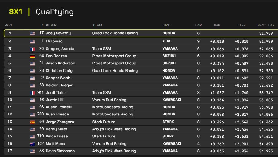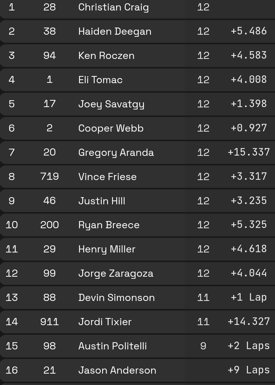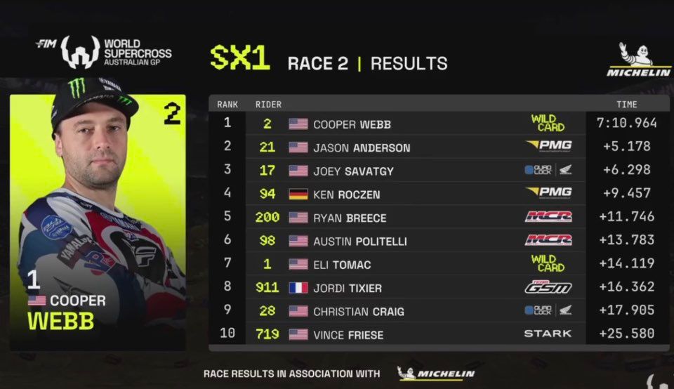 Behind Roczen, Christian Craig finished second. Craig rode a very strong event and even managed to win the final race. Cooper Webb ended the night in third place and won the second sprint race. Eli Tomac finished fourth, but he struggled with problems on the track especially in the second and third motos. Haiden Deegan showed some good things throughout the evening. In the second moto he was running in second place when he crashed, but he came back in the third moto to finish second, which is an impressive achievement in such a strong field of riders.