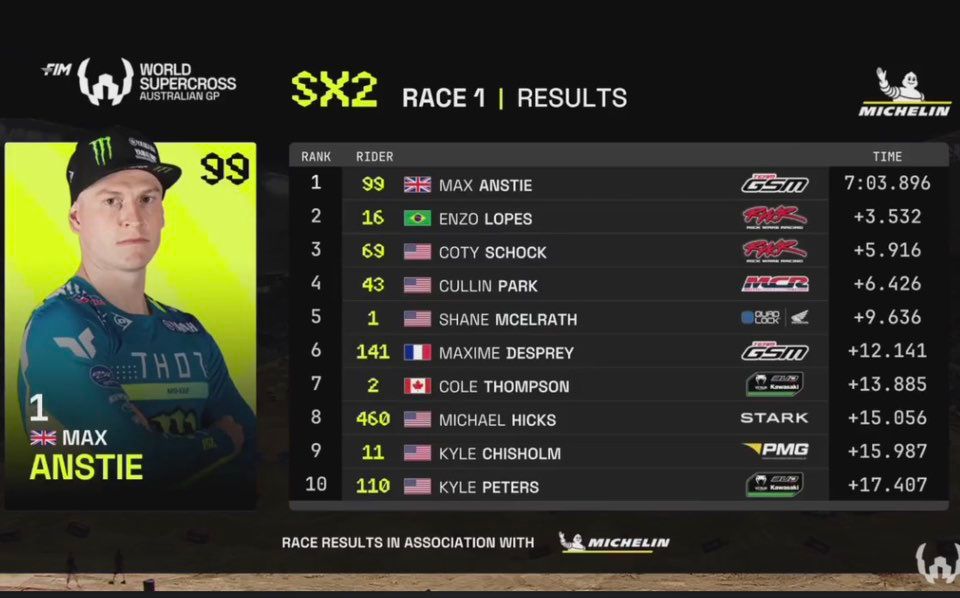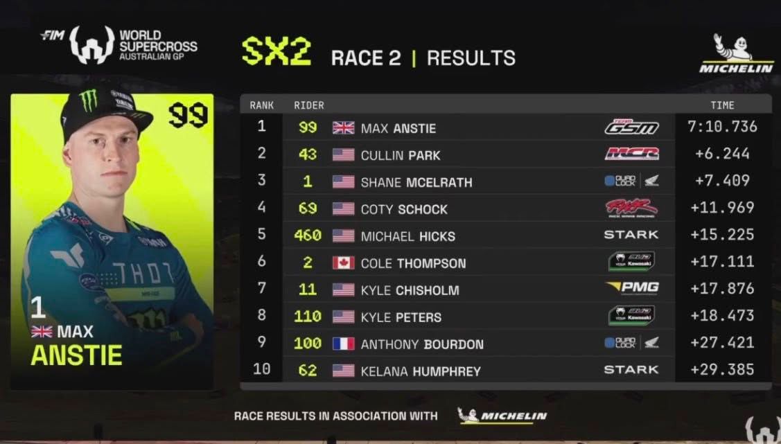Max Anstie remained unbeaten in the SX2 class and claimed the overall victory ahead of Shane McElrath and Cullin Park.