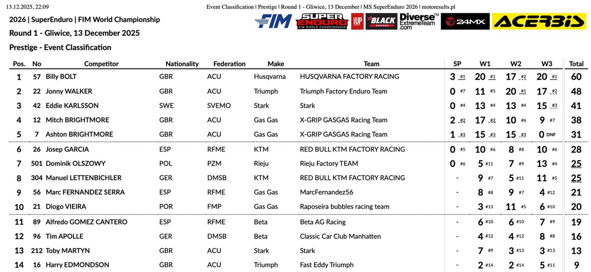 Billy Bolt won the opening round of the SuperEnduro World Championship in Poland. Bolt finished 1-2-1 in the races, securing the overall victory ahead of Jonny Walker and Eddie Karlsson.