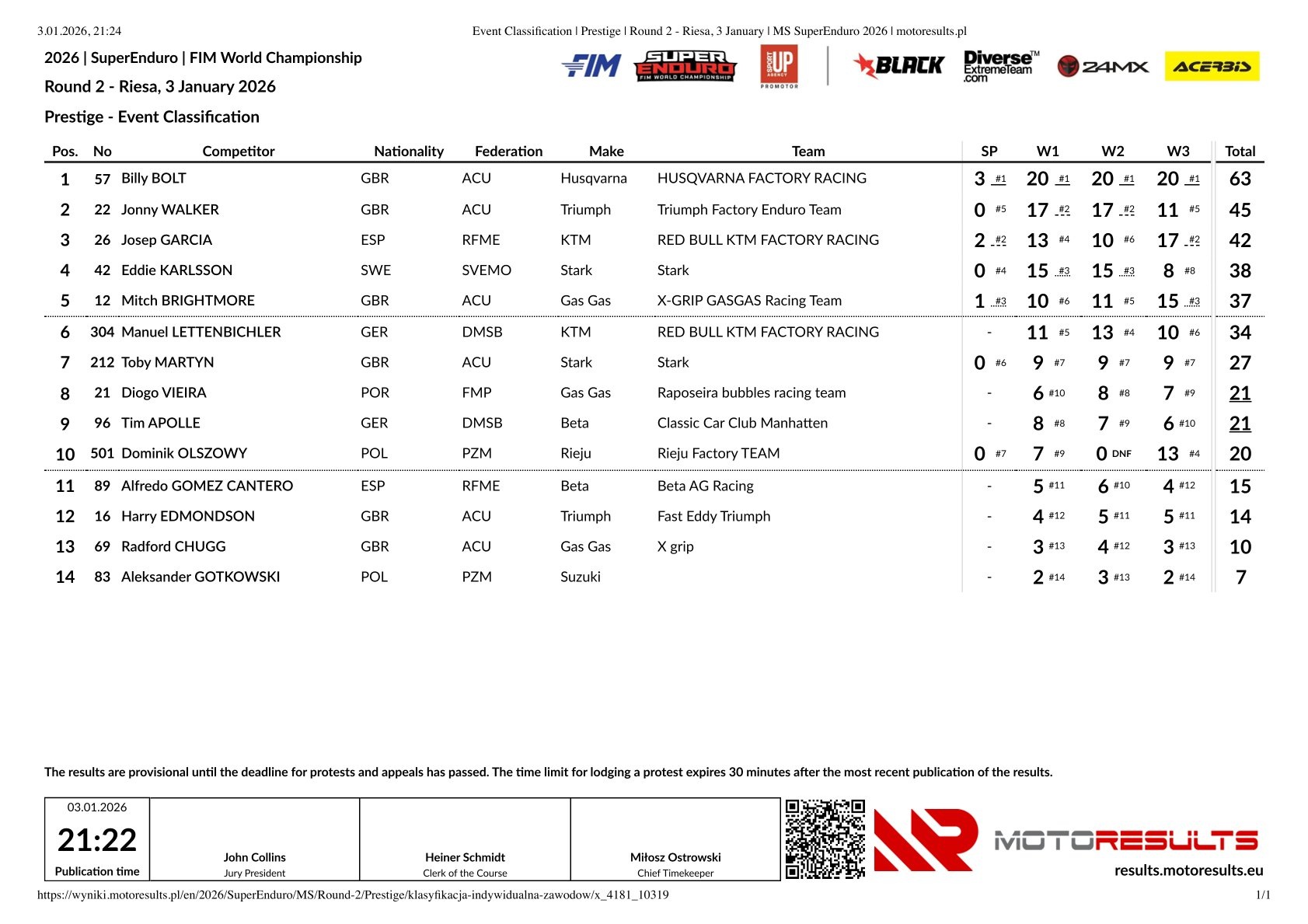 Jonny Walker finished second with results of 2-2-5 in the races, while Josep Garcia claimed his first SuperEnduro World Championship podium with a 4-6-2 score. Eddie Karlsson rode strongly in the first two races, finishing third on both occasions. However, an eighth place in the third race meant he narrowly missed out on the podium and had to settle for fourth, ahead of Mitchel Brightmore.