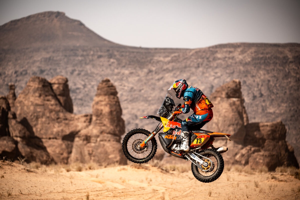Red Bull KTM Factory Racing’s Luciano Benavides delivered a standout ride aboard his KTM 450 RALLY to win stage five of the 2026 Dakar Rally. Daniel Sanders placed third, just under six minutes back, to regain the overall rally lead. Edgar Canet’s challenge was halted midway through the stage when damage to his rear mousse forced him to stop for repairs. Although the Spaniard lost considerable time, he made it to the end of the special and completed the stage.