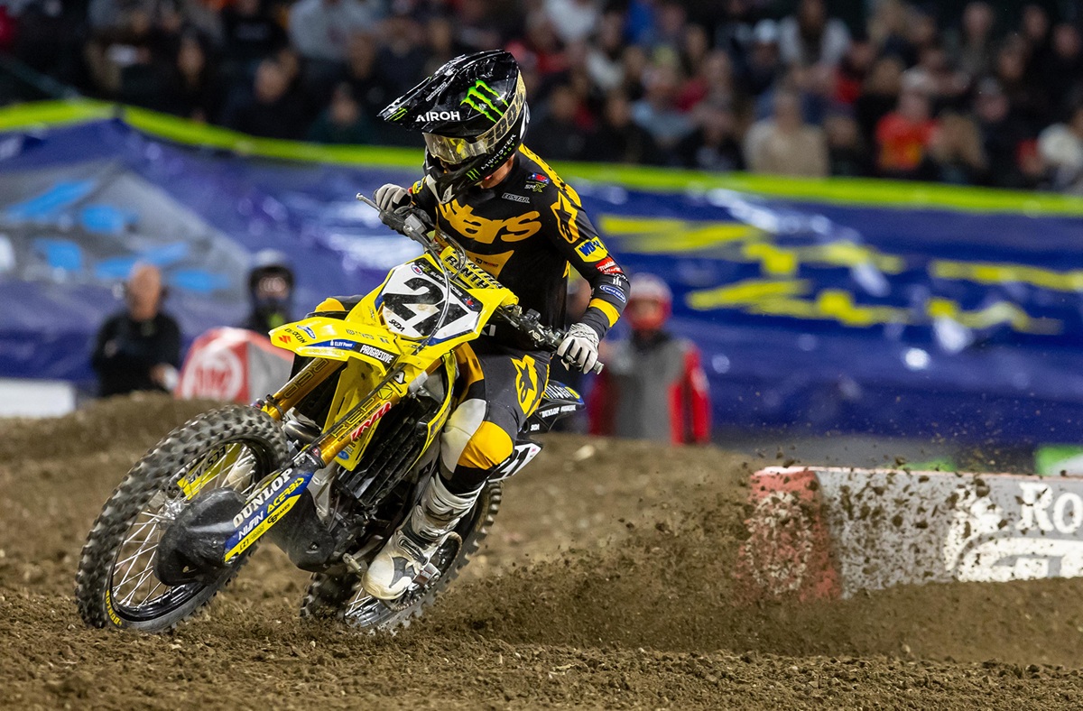 Fresh off of his 2025 FIM World Supercross Championship aboard his Suzuki RM-Z450, Jason Anderson (21) put his Suzuki into the top five at his AMA debut with the Twisted Tea Suzuki presented by Progressive Insurance team.