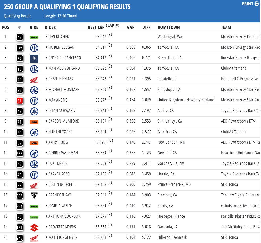 In the 250 class, Levi Kitchen claimed the fastest time ahead of Haiden Deegan and Ryder DiFrancesco. Max Vohland and Chance Hymas rounded out the top five.