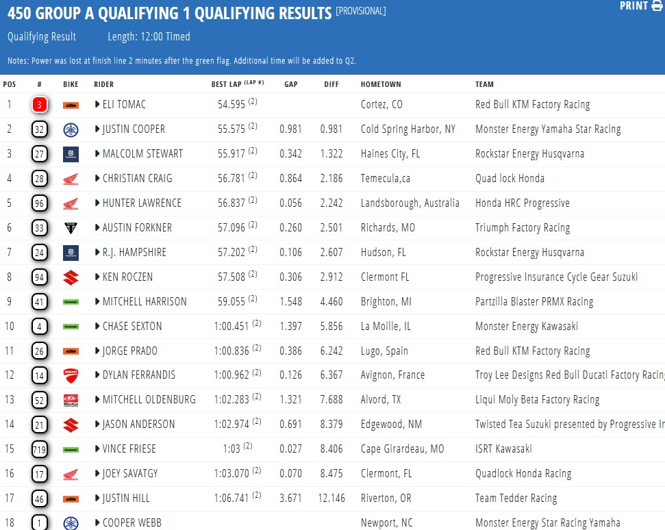 Tomac topped the timesheets ahead of Justin Cooper and Malcolm Stewart. Christian Craig also showed strong form with the fourth-fastest time, while Hunter Lawrence completed the top five.