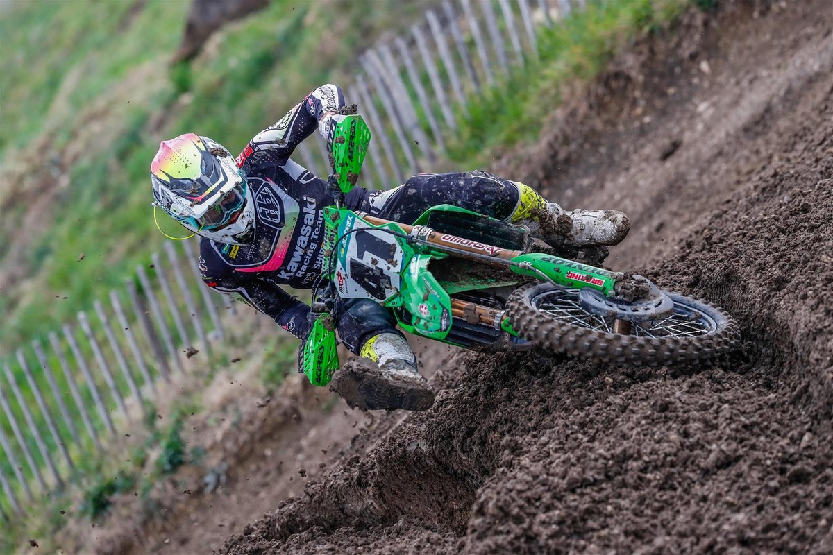 Mathis Valin was dominant in the MX2 category, which ran concurrently with MXGP, to claim victory despite a DNF in race two after he had been knocked off by a 450 rider at the start. In morning Timed Training before the rain he had posted third-fastest time against the 450s aboard his KX250-SR and even a pit-stop for fresh goggles in the first moto could not prevent him from finishing sixth, nearly a minute ahead of the next 250, in the combined classification. Fifth overall in the final moto earnt him the top step of the podium in MX2.