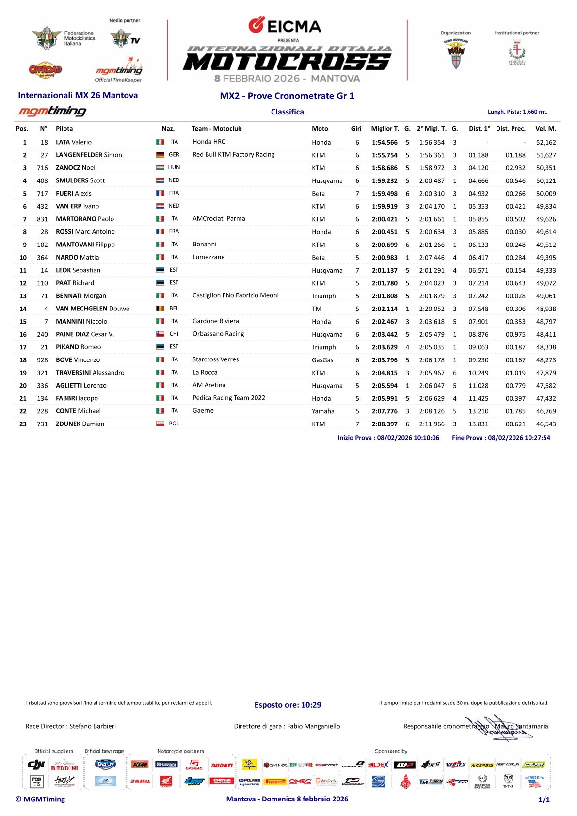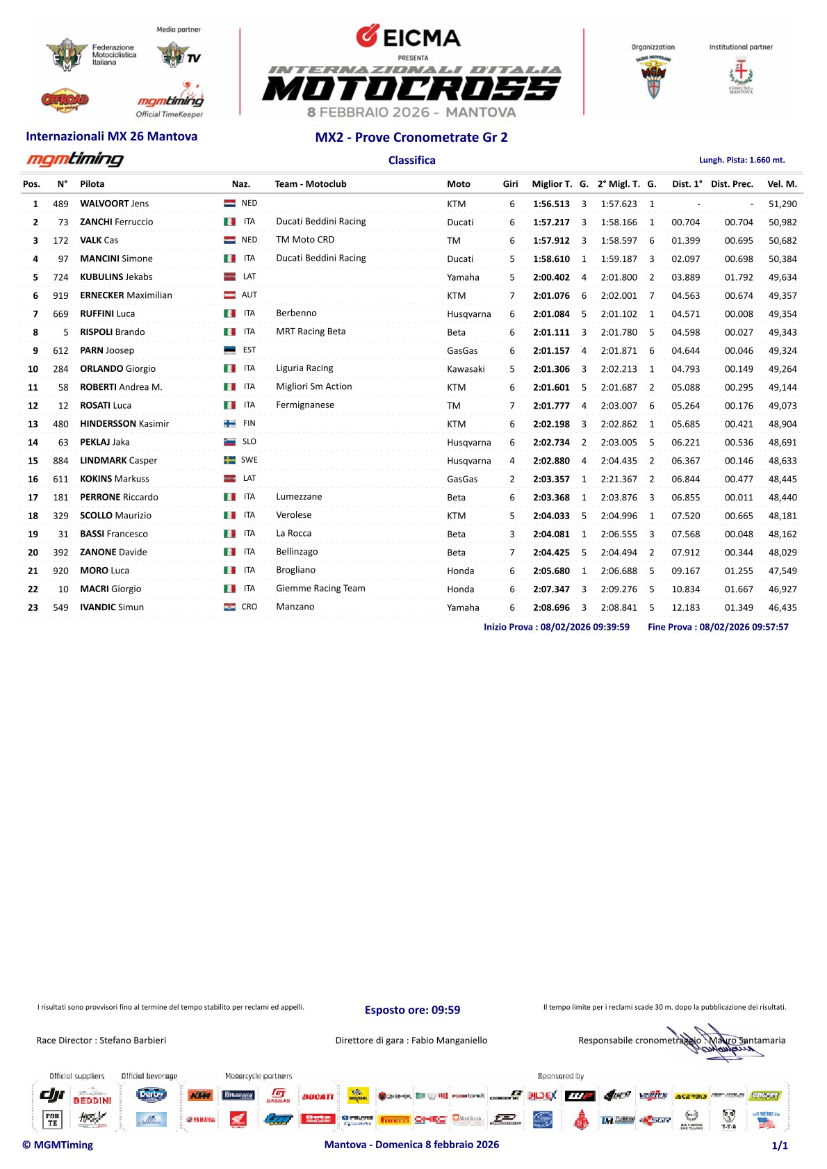 In the 250 class, we saw a very fast lap from Dutch rider Jens Walvoort. In the first group, he posted the quickest time ahead of Ferruccio Zanchi and Cas Valk. In the other group, Valerio Lata was the fastest ahead of Simon Laengenfelder and Noel Zanocz .