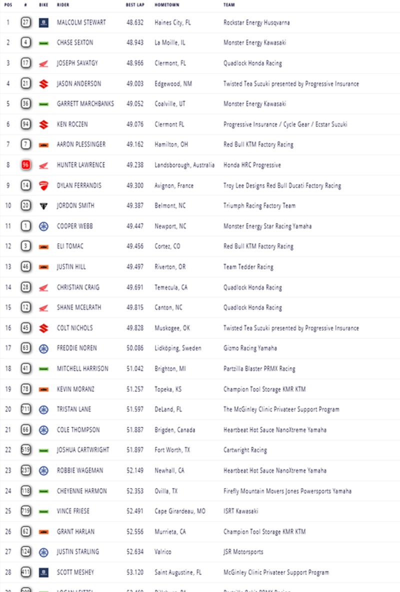 Brown and Stewart Take Pole Position in Arlington February 21, 2026February 21, 2026 Pierce Brown and Malcolm Stewart claimed pole positions during the seventh round of the American Supercross Championship in Arlington. Check out the full results below: 450: 250: Photocredits – Align Media