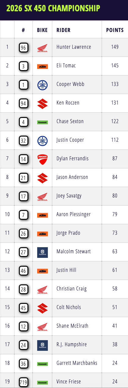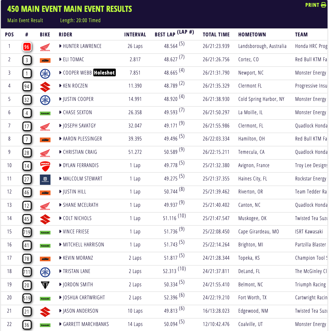 In the overall standings, Lawrence has extended his lead over Tomac to four points. Webb now sits in third place, sixteen points behind.
