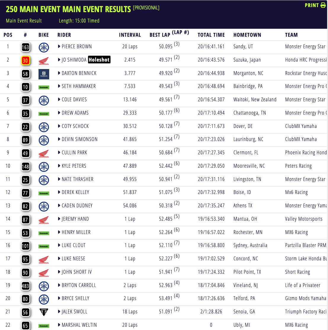 In the 250 class (East Coast), the win went to Pierce Brown ahead of Jo Shimoda and Daxton Bennick. Seth Hammaker and Cole Davies completed the top five. Because this was the first race of the season, Brown is the leader in the championship!