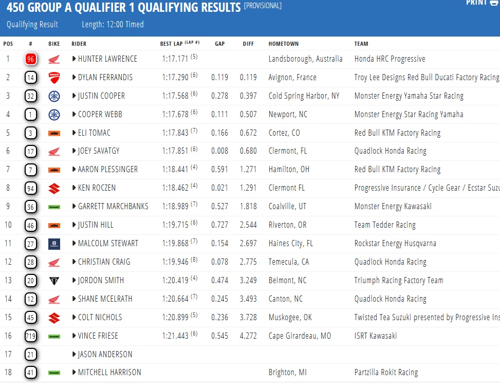 Seth Hammaker and Hunter Lawrence set the fastest times in the first qualifying session of the Supercross in Daytona. Check out the times below!