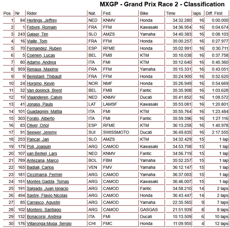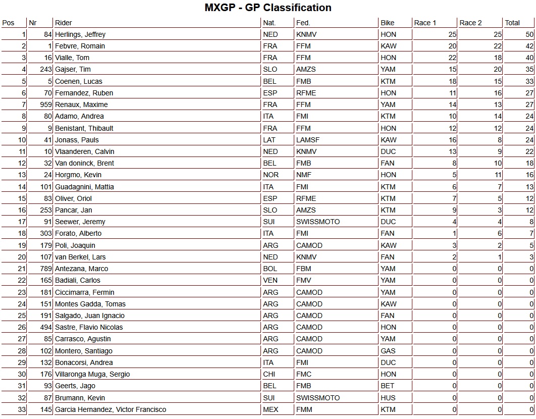In the overall Grand Prix classification, Herlings took the win ahead of Romain Febvre in second and Vialle in third.