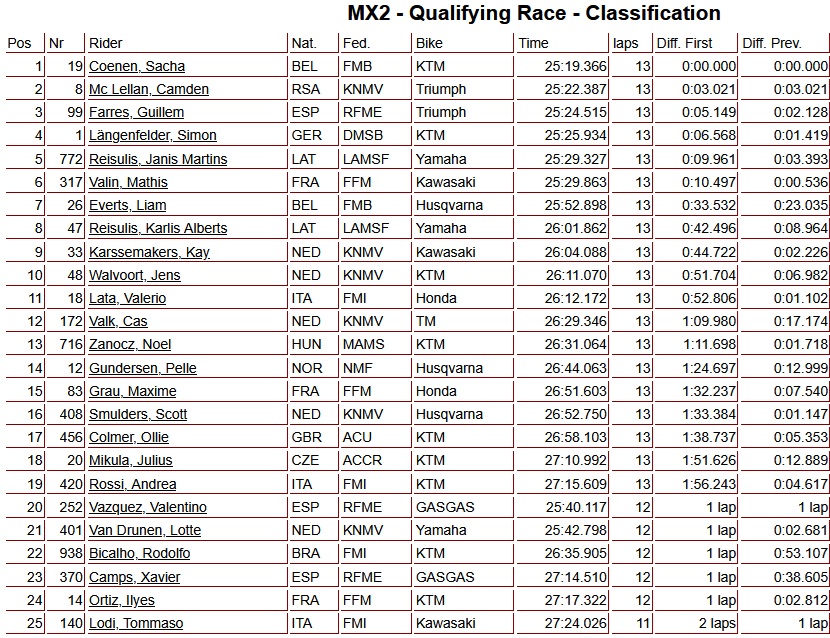 Camden Mc Lellan finished in second place, while Guillem Farrés secured third. This result puts Coenen in a strong position heading into Sunday’s races.