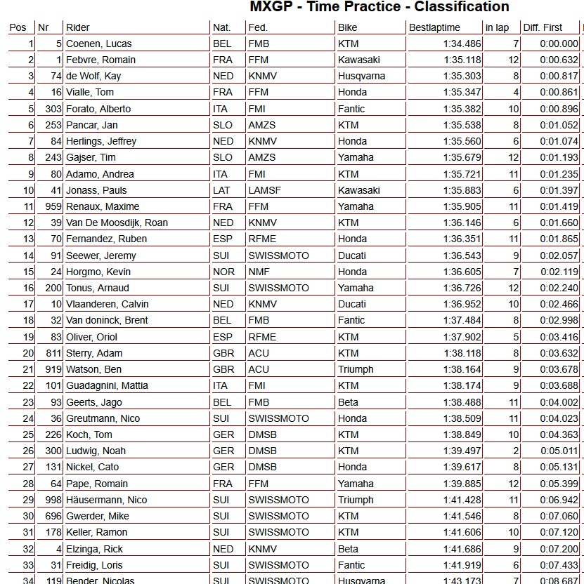In the MXGP timed practice session in Switzerland, Lucas Coenen clocked the fastest lap, ahead of Romain Febvre in second and Kay de Wolf in third. Tom Vialle, Alberto Forato and Jan Pancar completed the top six, while Jeffrey Herlings finished seventh. Calvin Vlaanderen was 17th and Rick Elzinga placed 32nd.