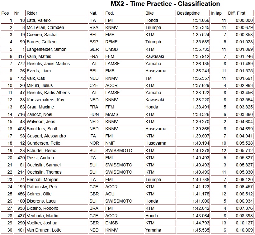 In MX2, Valerio Lata set the fastest time, followed by Camden McLellan and Sacha Coenen.