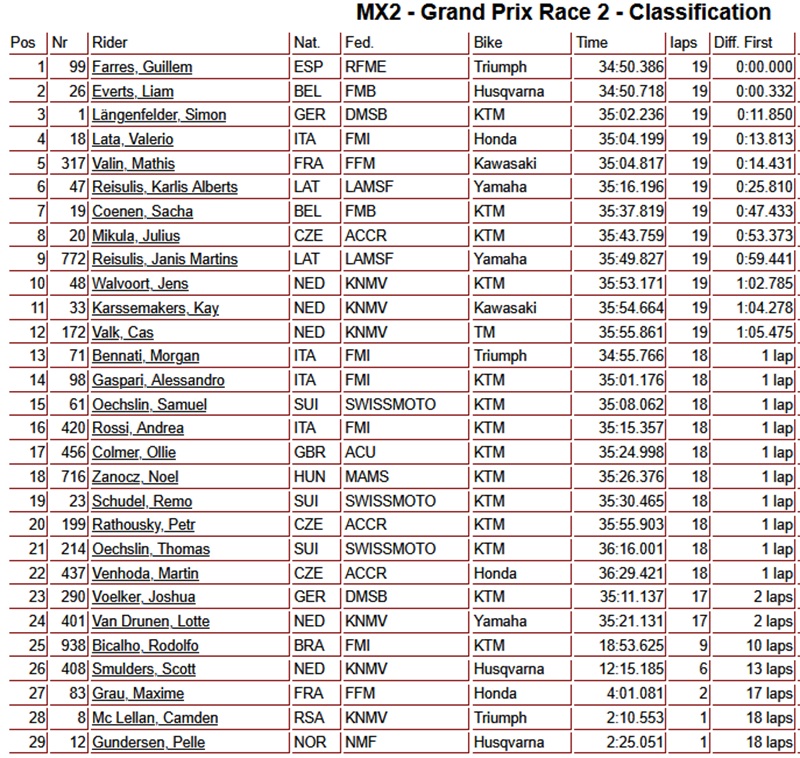 Guillem Farrés won the second MX2 moto in Switzerland, with the Spaniard managing to hold off Liam Everts, while Simon Längenfelder finished third. Valentin Lata came home in fourth place ahead of Mathis Valin.