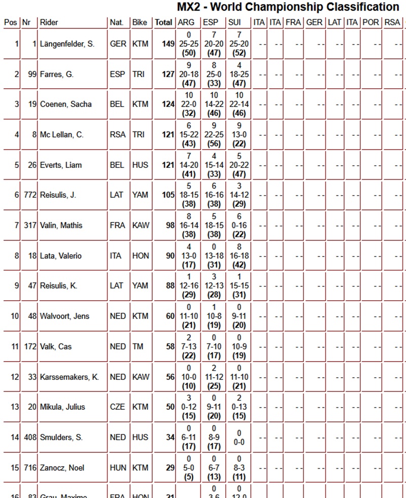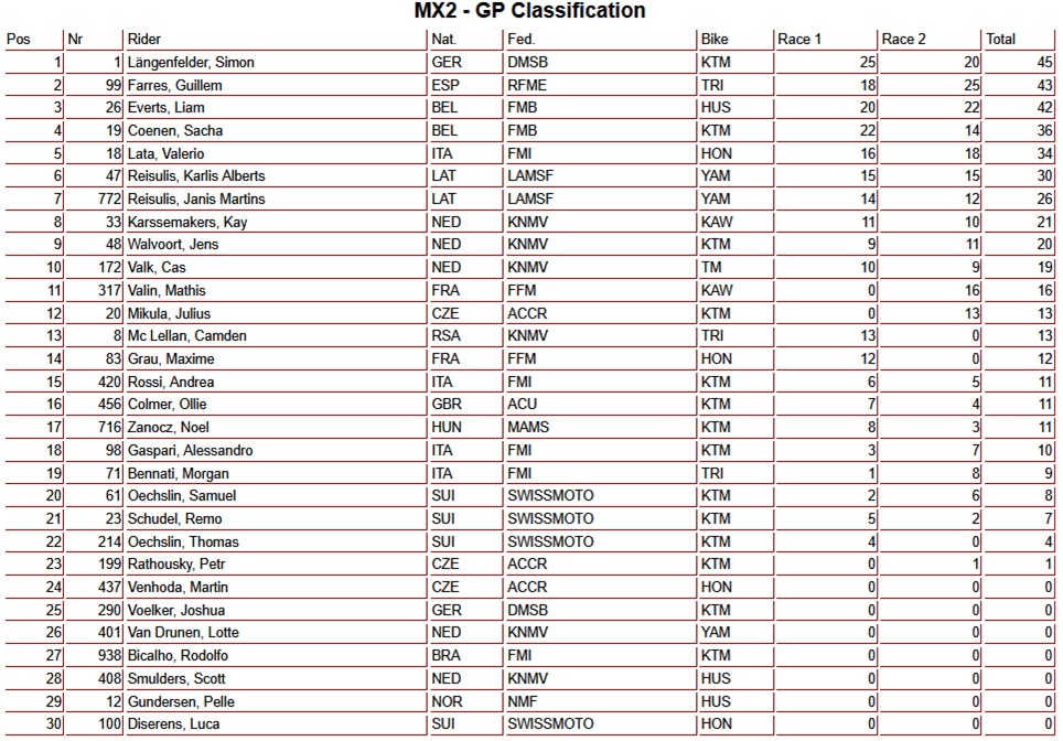For red plate holder Camden McLellan, it turned into a disastrous outing. After finishing eighth in the first moto, he crashed out early in the second race. Längenfelder now takes over the lead in the MX2 World Championship standings.
