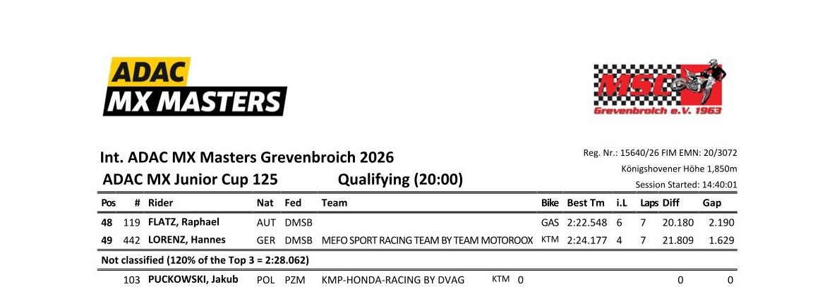 Emil Ziemer set the fastest time in the 125 class qualifying session in Grevenbroich. Lucas Leok was just a fraction slower and recorded the second-fastest time ahead of Aston Allas. Finn Lange and Tim Schroter set the fourth and fifth fastest times.