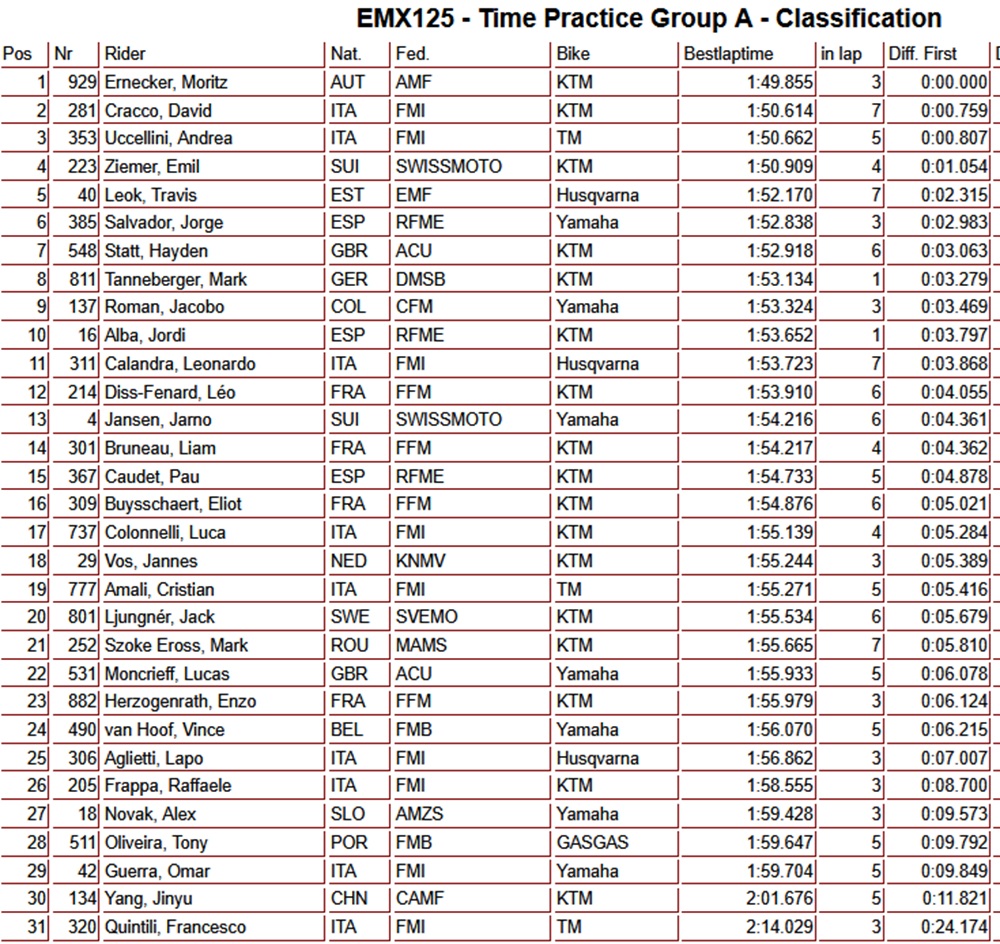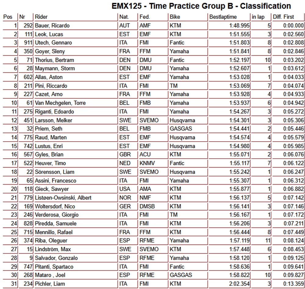 Ernecker and Bauer fastest in EMX125 time practice in Sardegna April 11, 2026April 11, 2026 With these strong performances, both riders have secured an excellent position heading into the rest of the weekend. Full results are listed below.