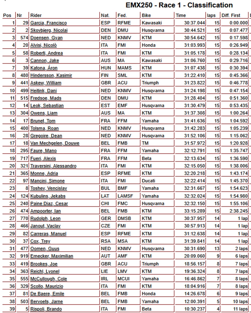 Francisco Garcia has won the first EMX250 moto in Italy. Skjovberg finished in second place, followed by Doensen in third. Dani Heitink had a difficult start to the race but fought back well to secure tenth place. Full results are listed below.