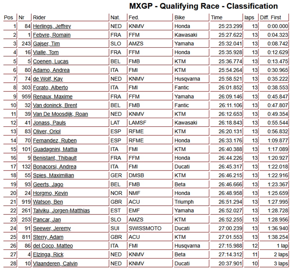 Jeffrey Herlings claimed victory in the MXGP qualifying race after an exciting battle with Romain Febvre. Tim Gajser finished in third place, followed by Tom Vialle in fourth. Lucas Coenen came home in fifth after recovering well from a crash at the start. Andrea Adamo finished sixth, while Kay de Wolf crossed the line in seventh after an impressive charge through the field.