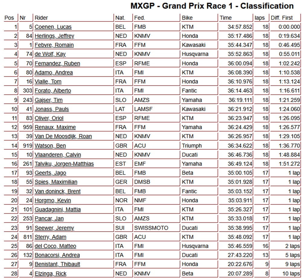 Lucas Coenen won the first moto in Riola Sardo. At the start, the Hondas got off the line very well, with Tom Vialle taking the holeshot ahead of Oriol Oliver and Jeffrey Herlings. Lucas Coenen started the race around tenth place and quickly moved forward, with the Belgian taking the lead from Jeffrey Herlings in the sixth lap.