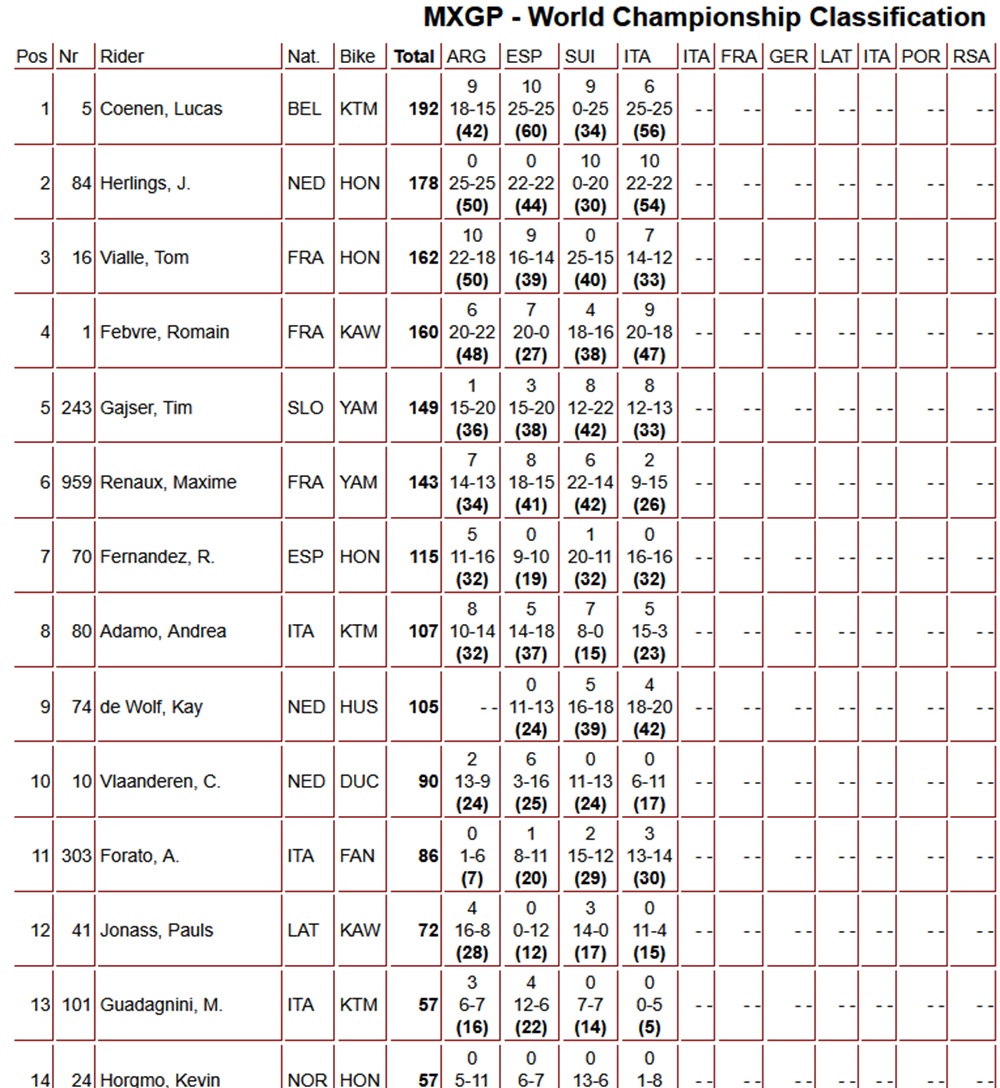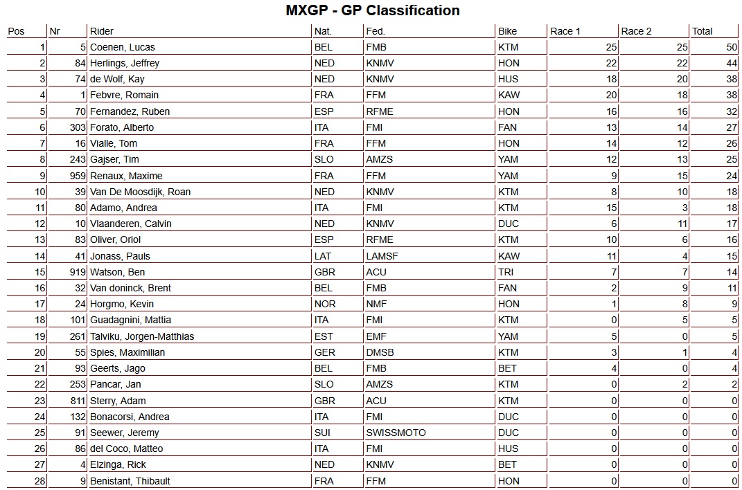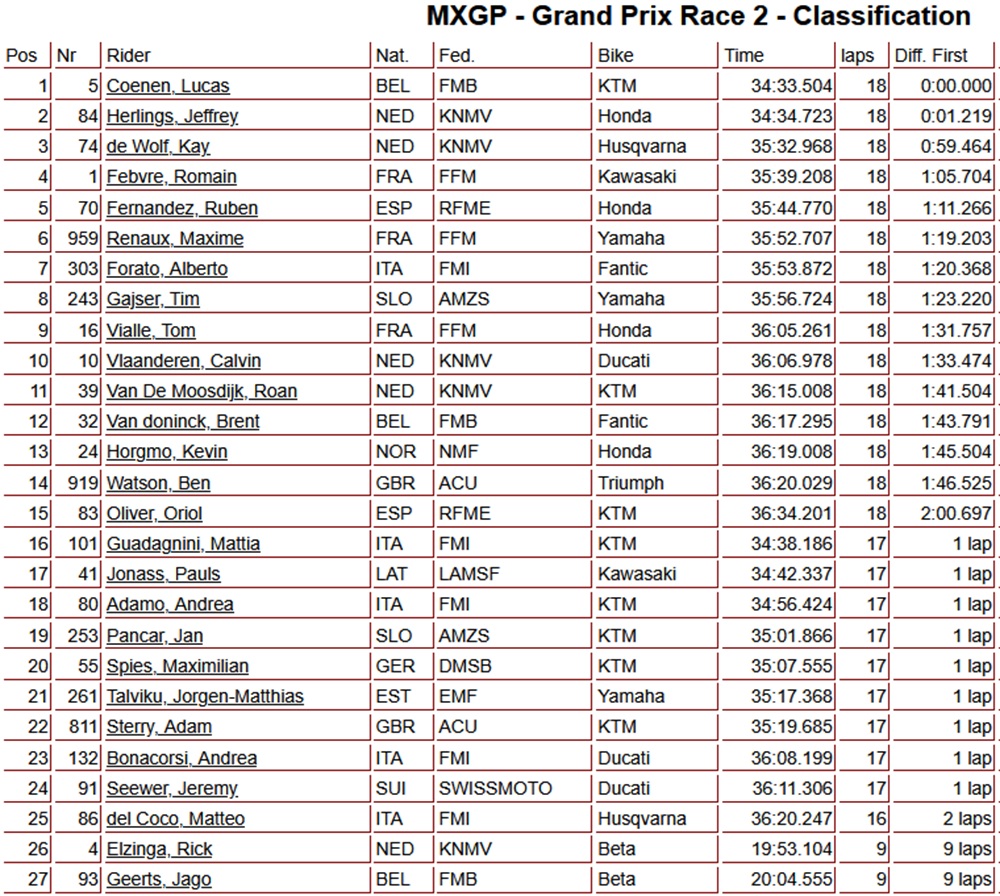 Lucas Coenen quickly took control of the race and looked set for a comfortable victory until he crashed in the closing stages. His twelve-second lead disappeared, allowing Herlings to close right up to the Belgian by the finish, but the Dutchman ultimately came up just short. Kay de Wolf delivered an impressive performance; after completing the first lap outside the top twenty, he fought his way back to third place. The podium for the MXGP of Sardinia consisted of Lucas Coenen, Jeffrey Herlings, and Kay de Wolf.