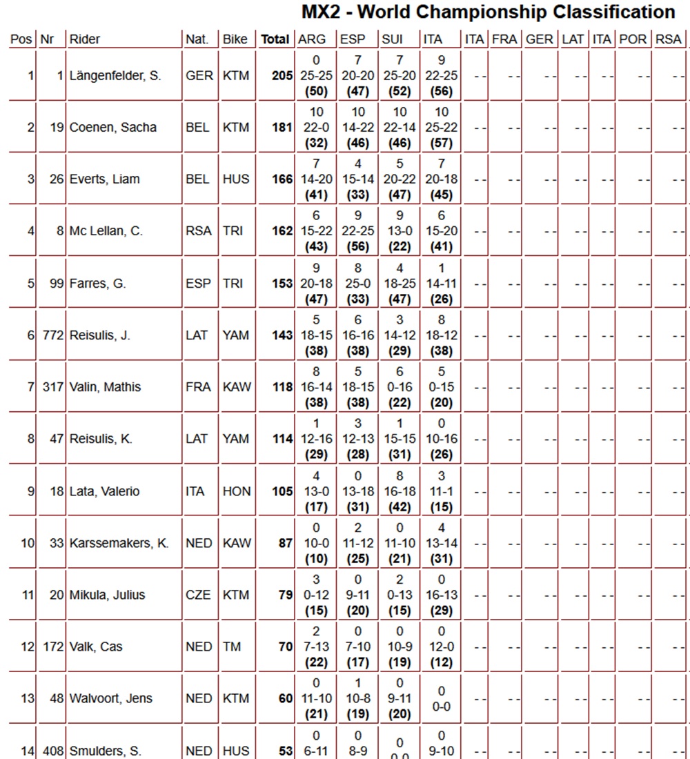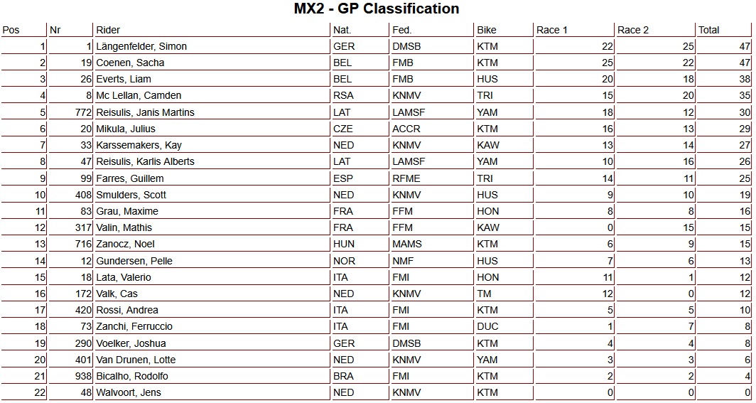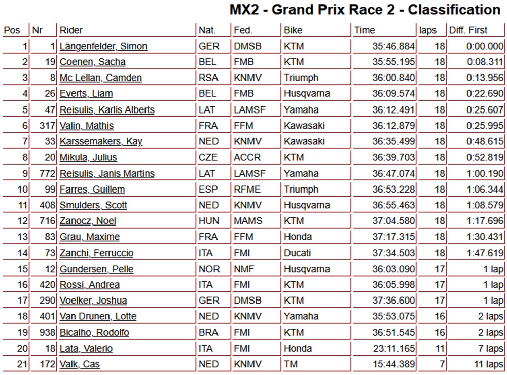 Once again, Sacha Coenen grabbed the holeshot in the second moto, but he went down in the early stages and dropped back to fourth place. This handed the lead to Simon Längenfelder, who never looked back. Coenen fought back strongly to finish second, ahead of Camden McLellan and Liam Everts.