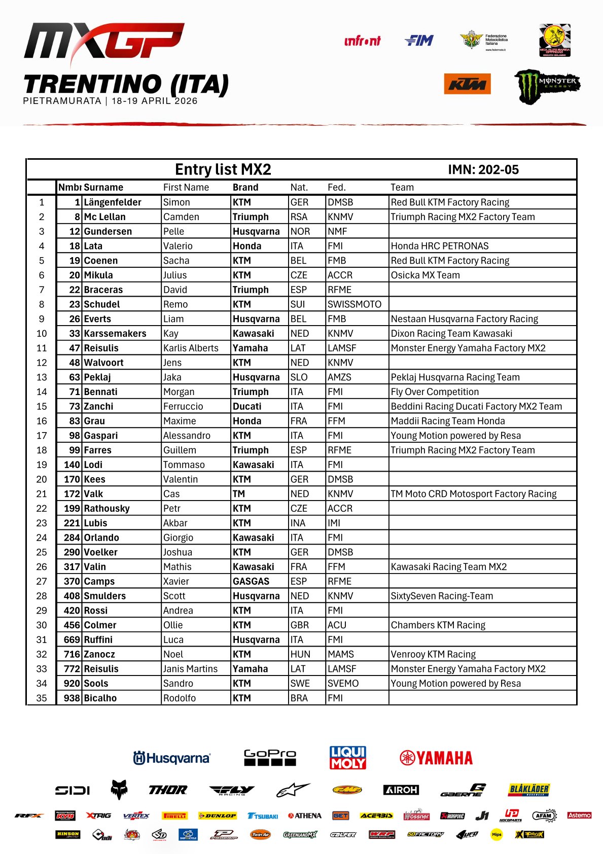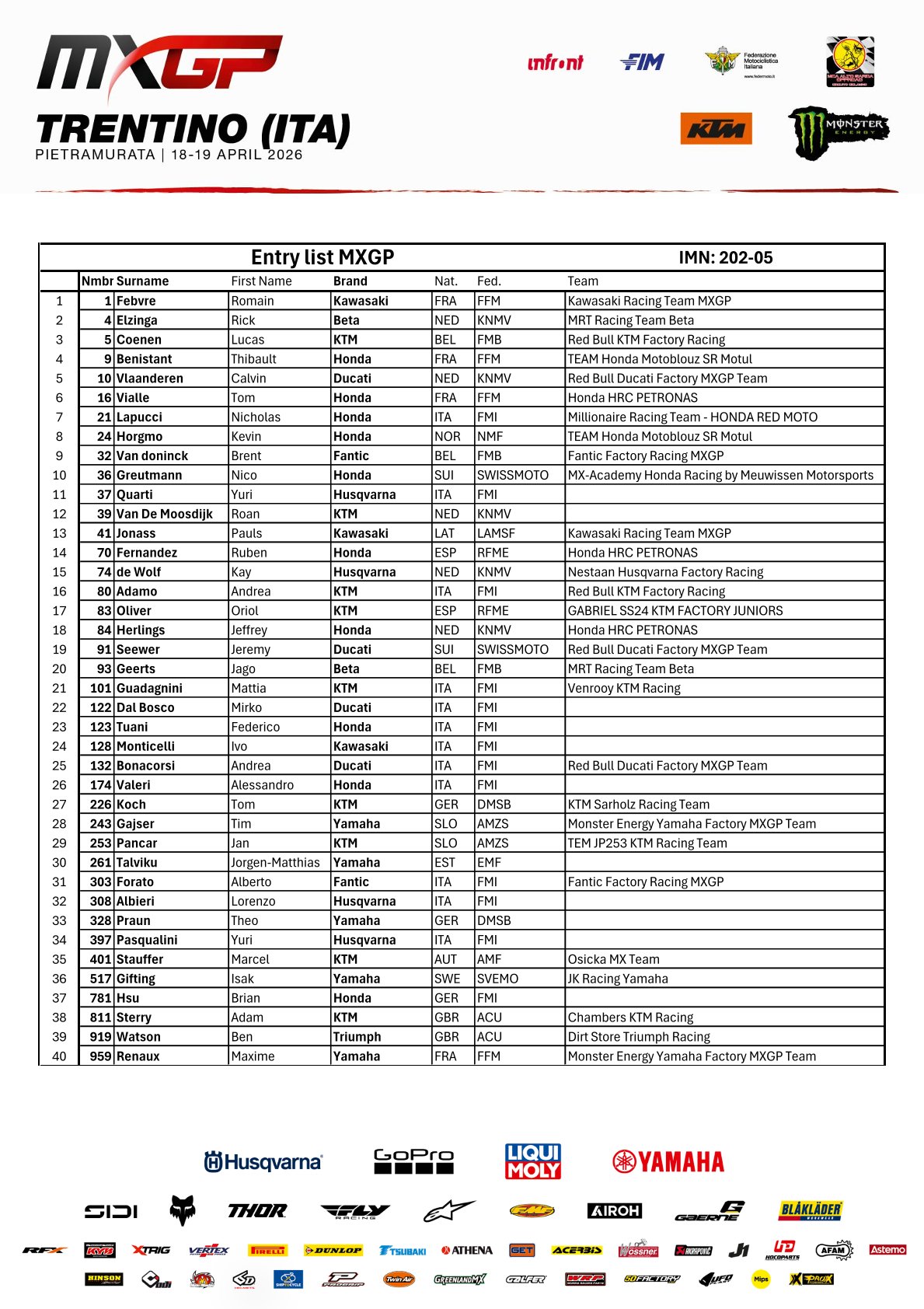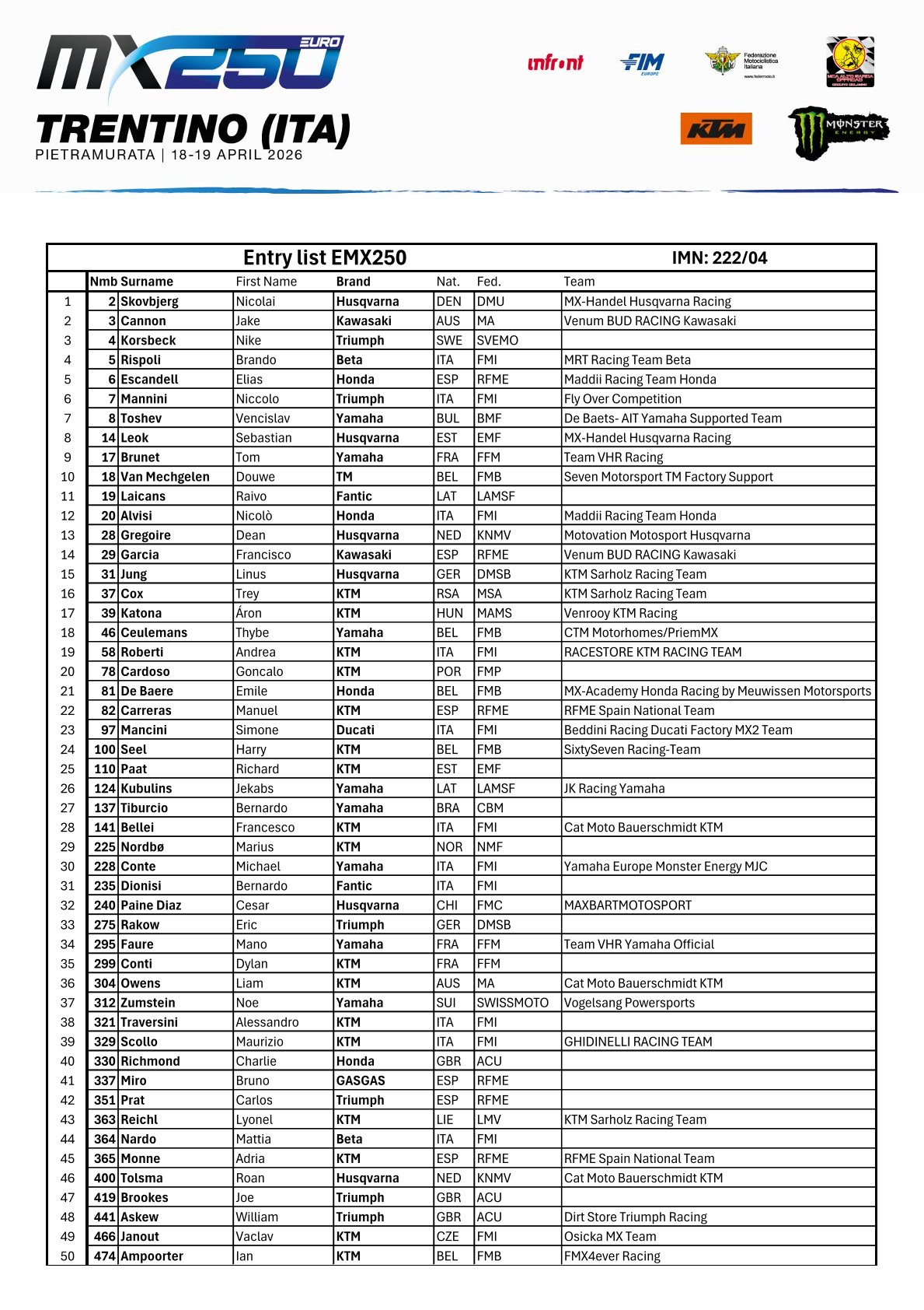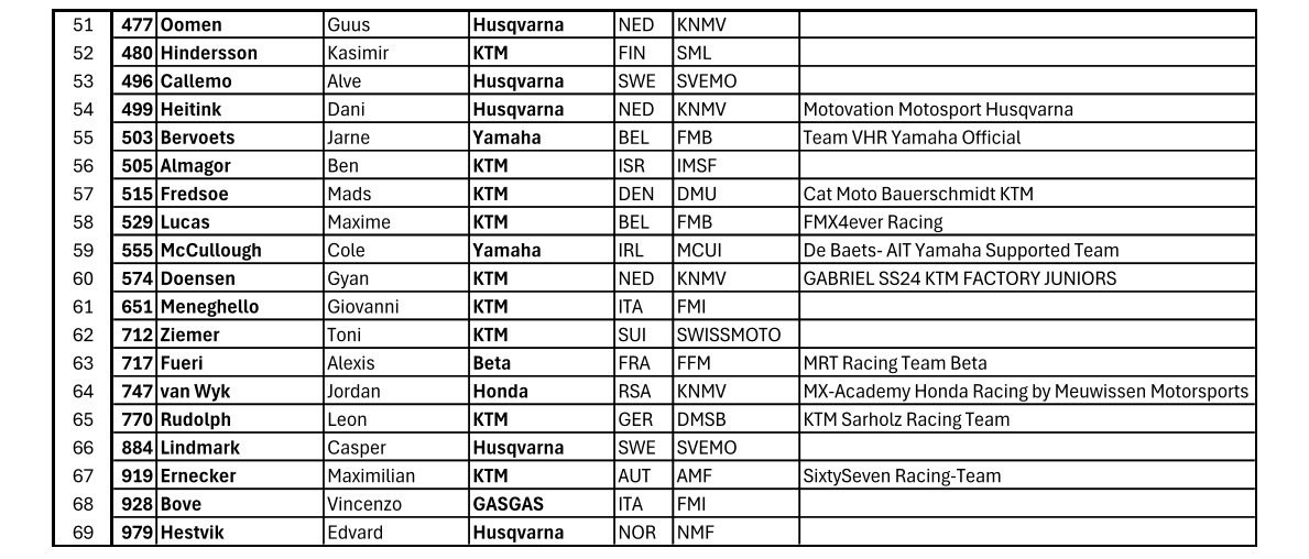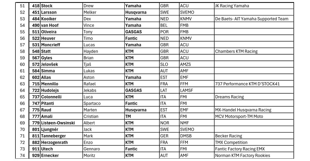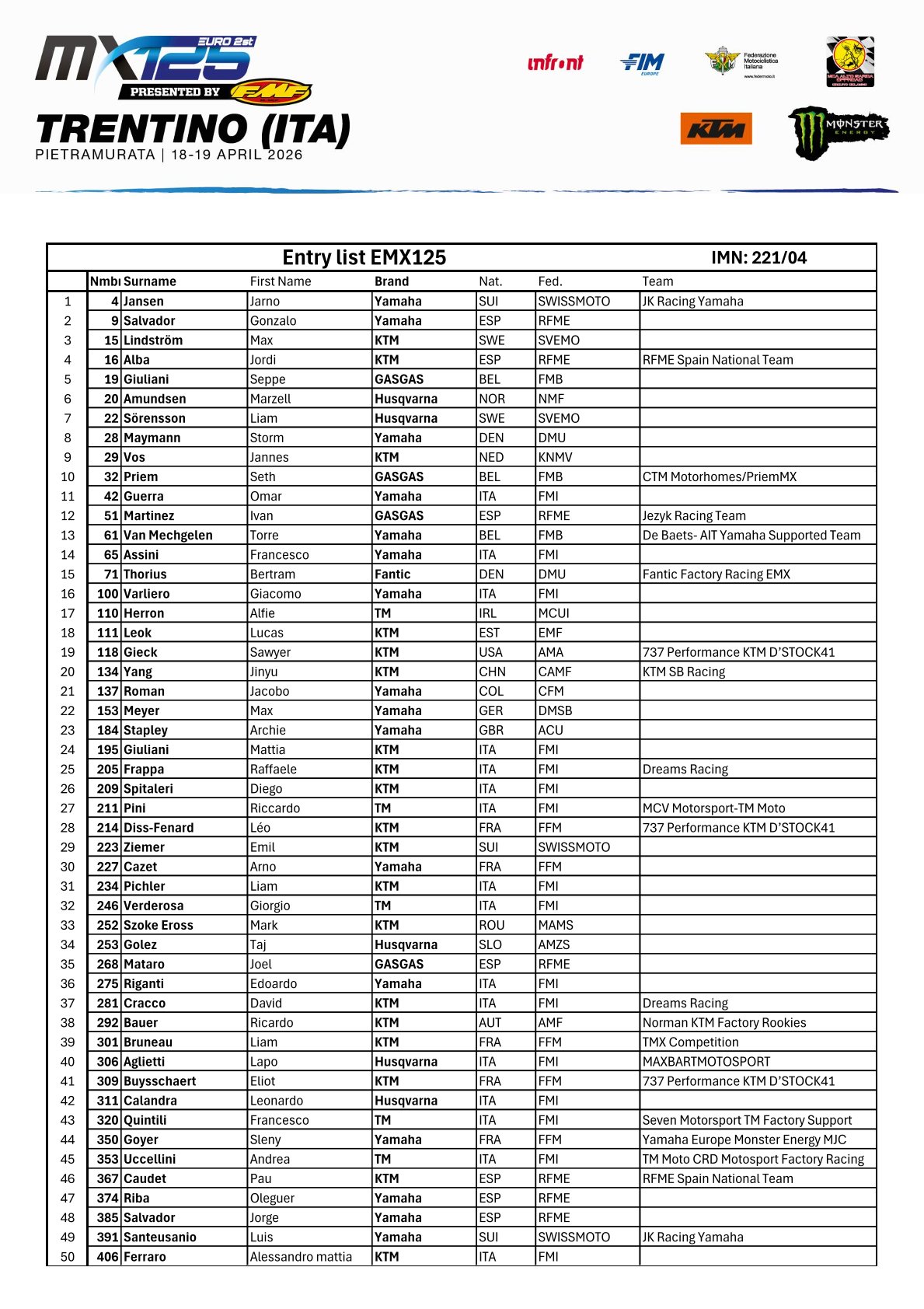 EMX125 Presented by FMF Racing ENTRY LIST