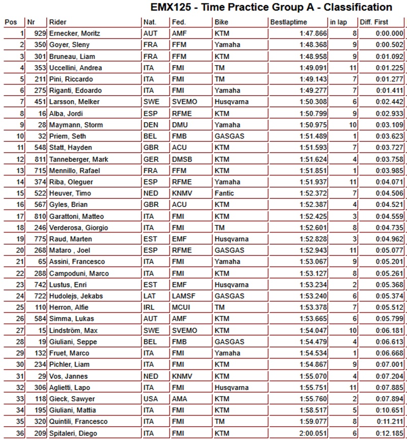 Moritz Ernecker recorded the fastest time in EMX125 group 1. This automatically means he will be the first to enter the track this afternoon for the first moto. Sleny Goyer set the second-fastest time, ahead of Liam Bruneau.