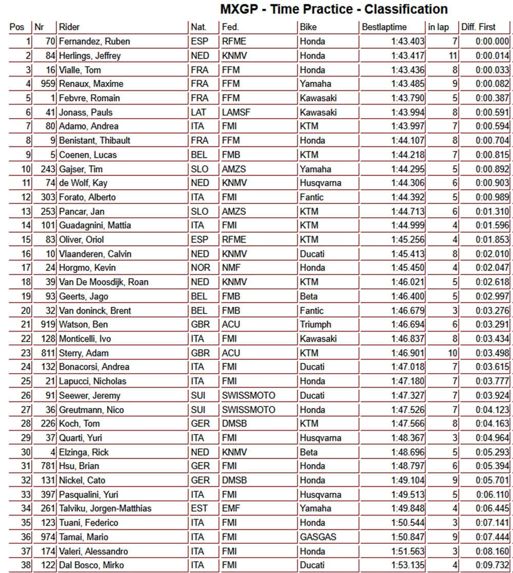 Ruben Fernandez set the fastest time in MXGP time practice. The Spaniard was 0.014 seconds quicker than Jeffrey Herlings, who recorded the second-fastest time.