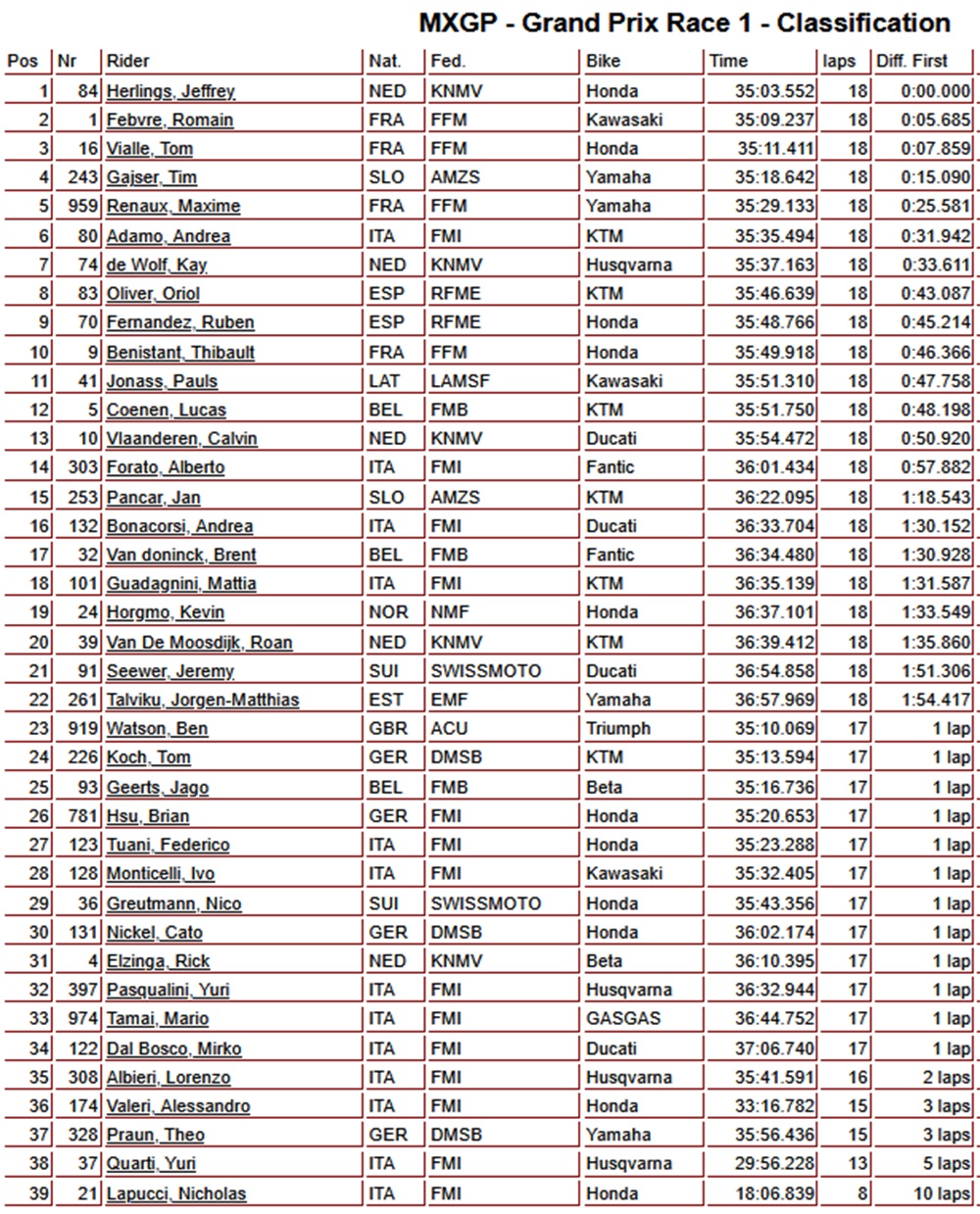 Behind a dominant Herlings, Romain Febvre finished second ahead of Tom Vialle, Tim Gajser, and Maxime Renaux. Championship leader Lucas Coenen crashed in the early stages and had to settle for 12th place.