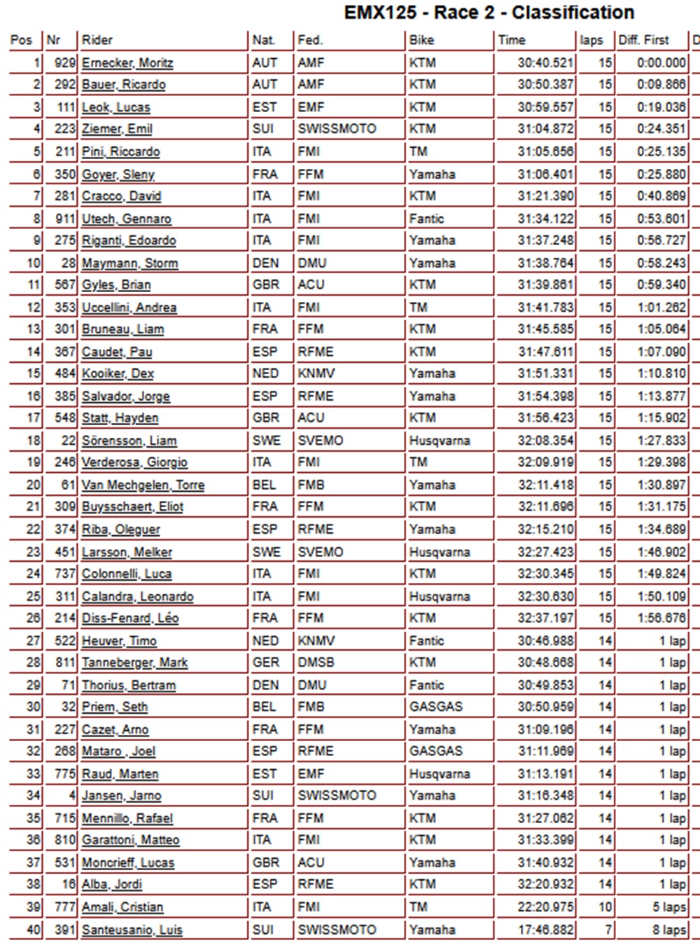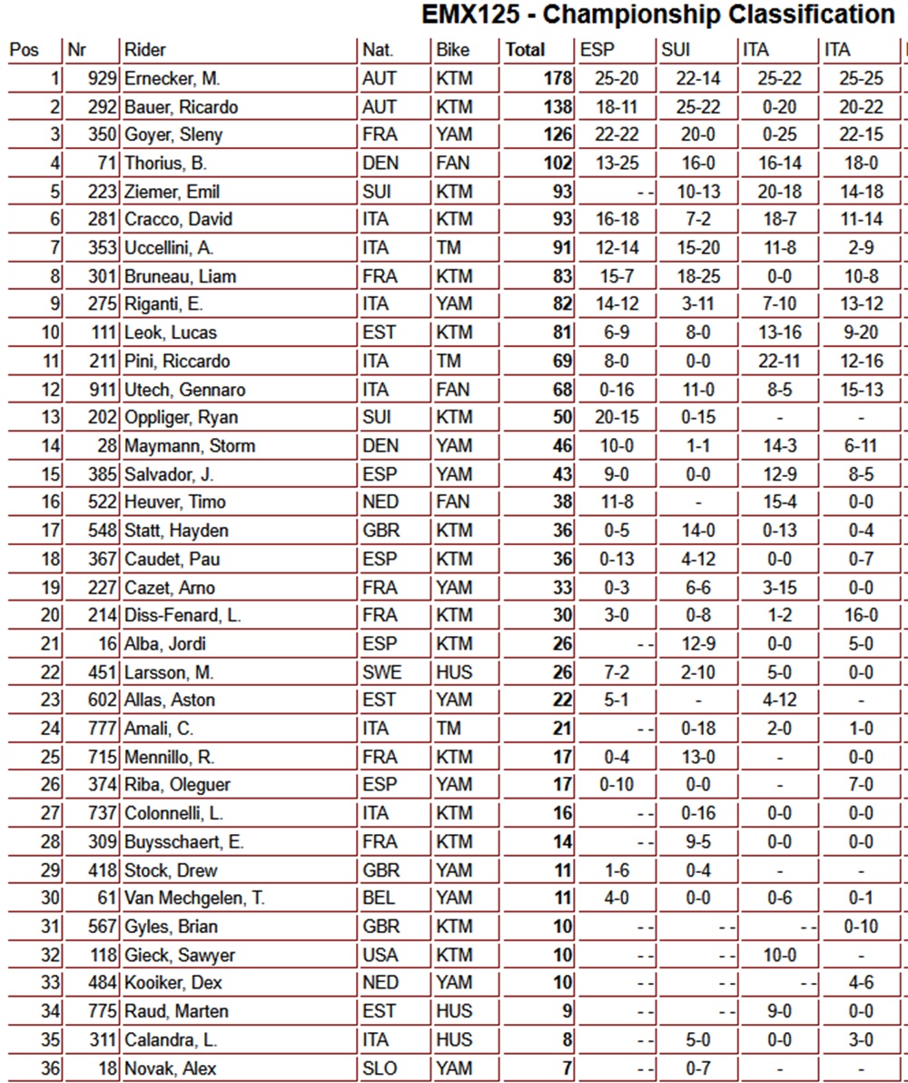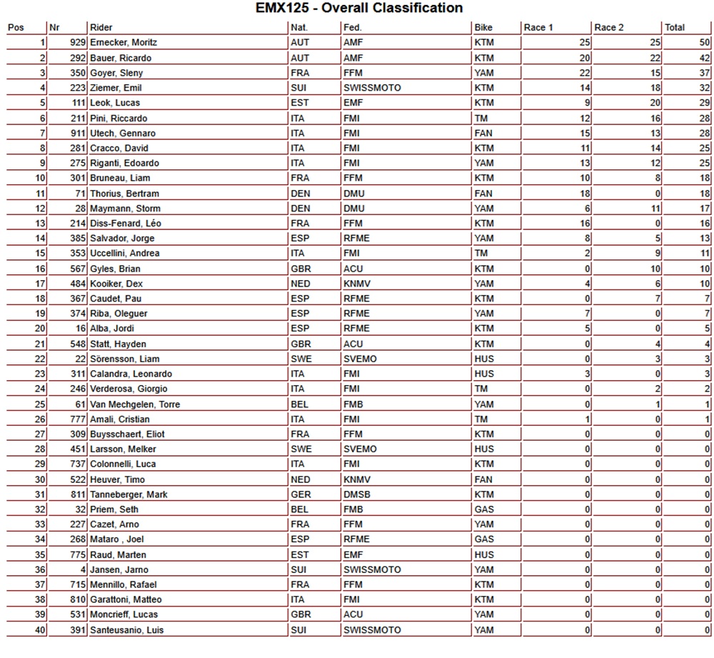 The EMX125 podium consisted of Moritz Ernecker 1-1, Ricardo Bauer 3-2, and Sleny Goyer 2-6. These three riders also lead the EMX125 standings in the same order.