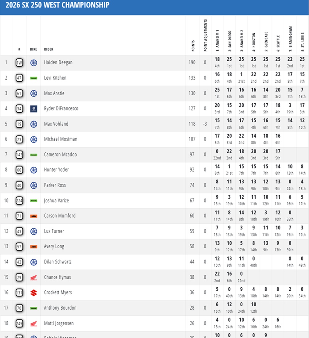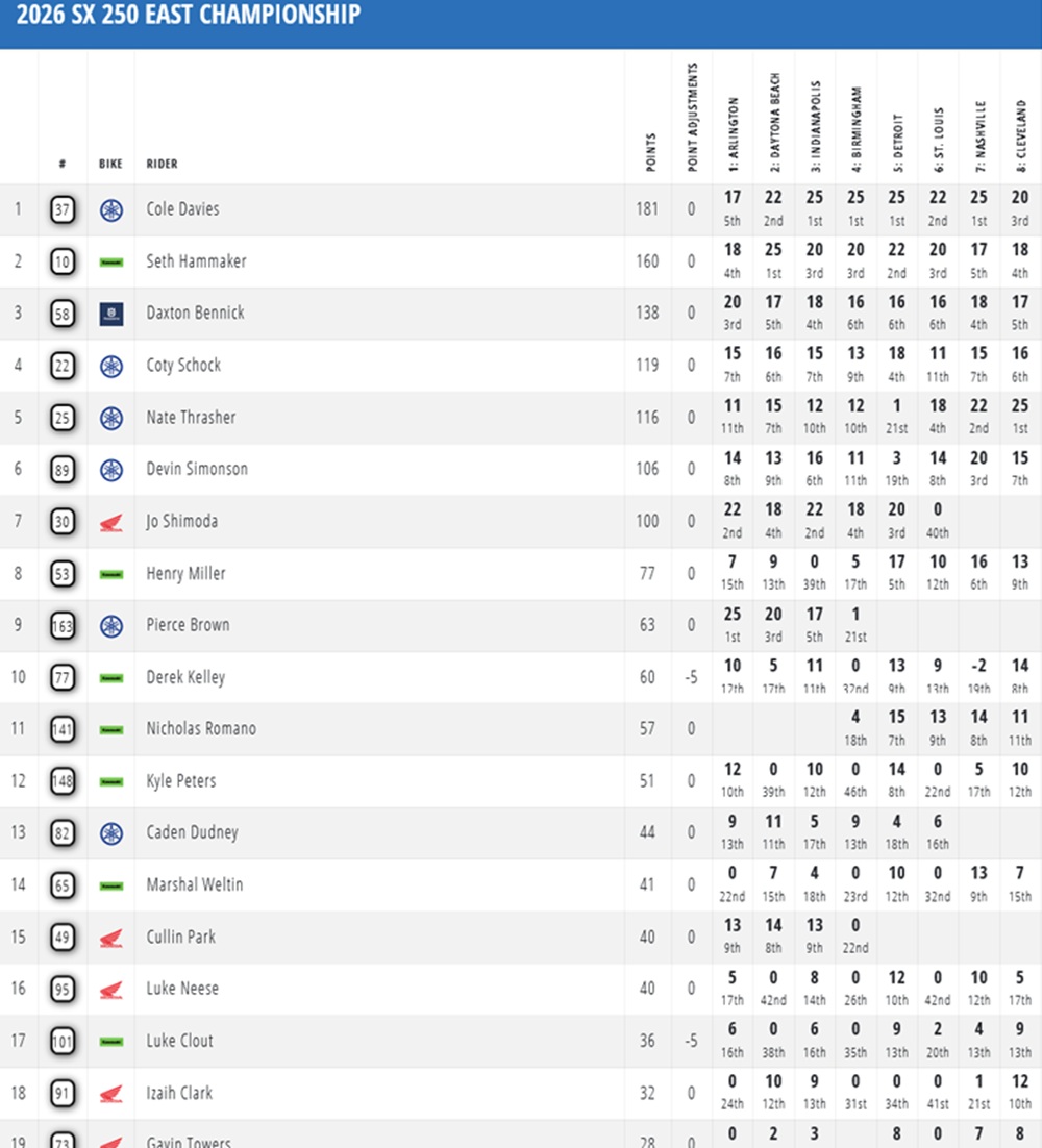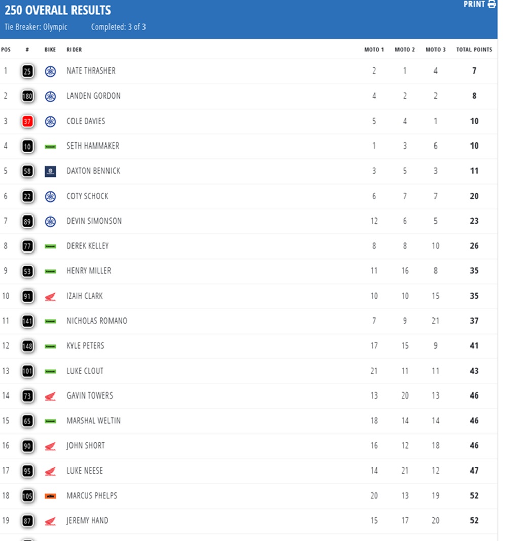Nate Thrasher has won the 250 class in Cleveland. The Yamaha rider was the most consistent competitor with finishes of 2-1-4. On the podium, he was joined by his teammates Landen Gordon (4-2-2) and Cole Davies (5-4-1).