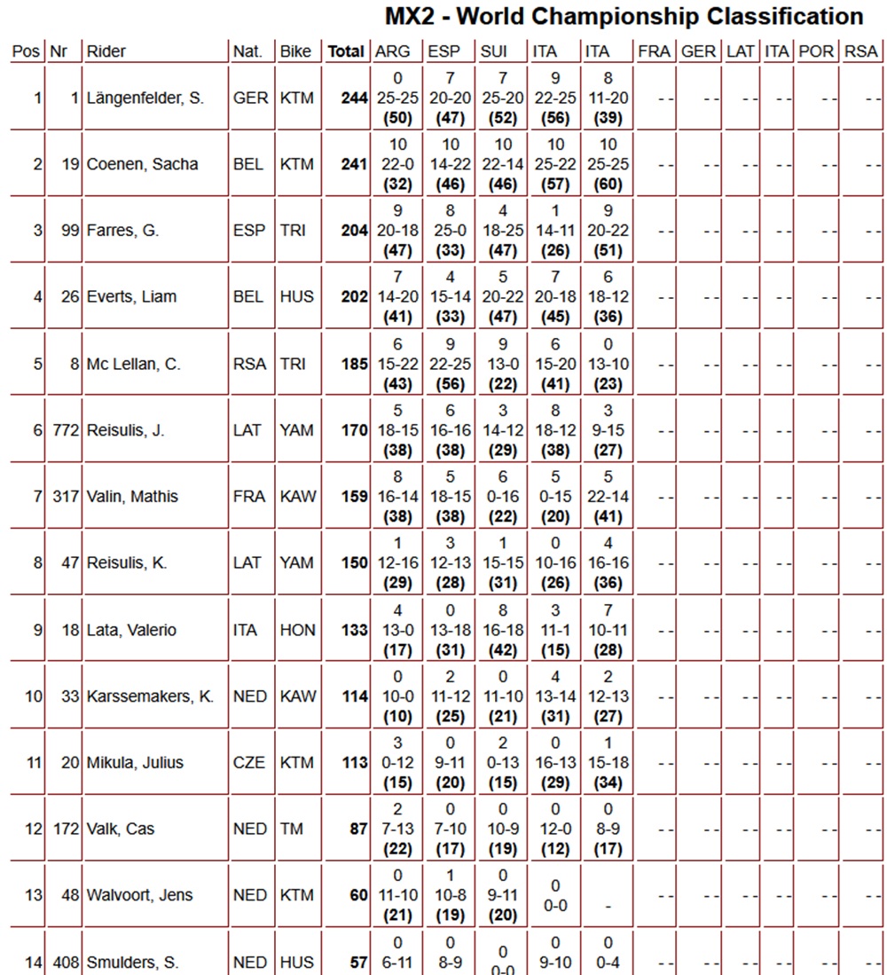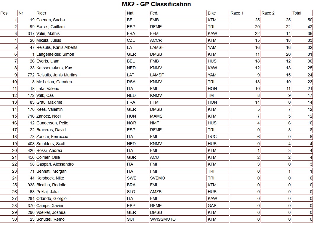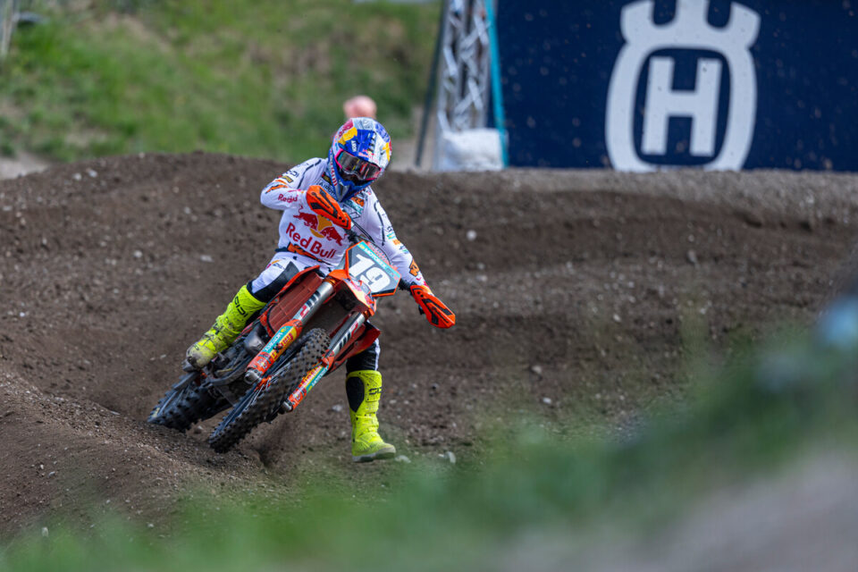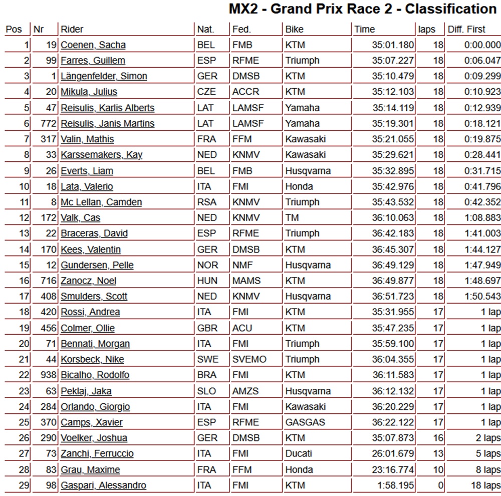 Sacha Coenen also won the second MX2 moto at the MXGP of Trentino. The Belgian did exactly the same as in the first moto (and the qualifying heat on Saturday): he grabbed the holeshot and was never seen again by the competition. Behind Coenen, Guillem Farres finished second, while Simon Längenfelder took third ahead of the impressive Julius Mikula and Karlis Alberts Reisulis.