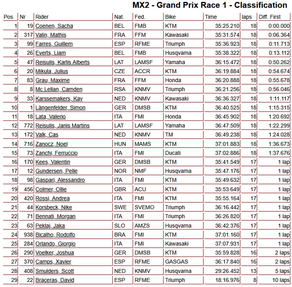 Behind the KTM rider, Mathis Valin was flagged off in second place, with Guillem Farres finishing third. Liam Everts and Karlis Alberts Reisulis completed the top five.