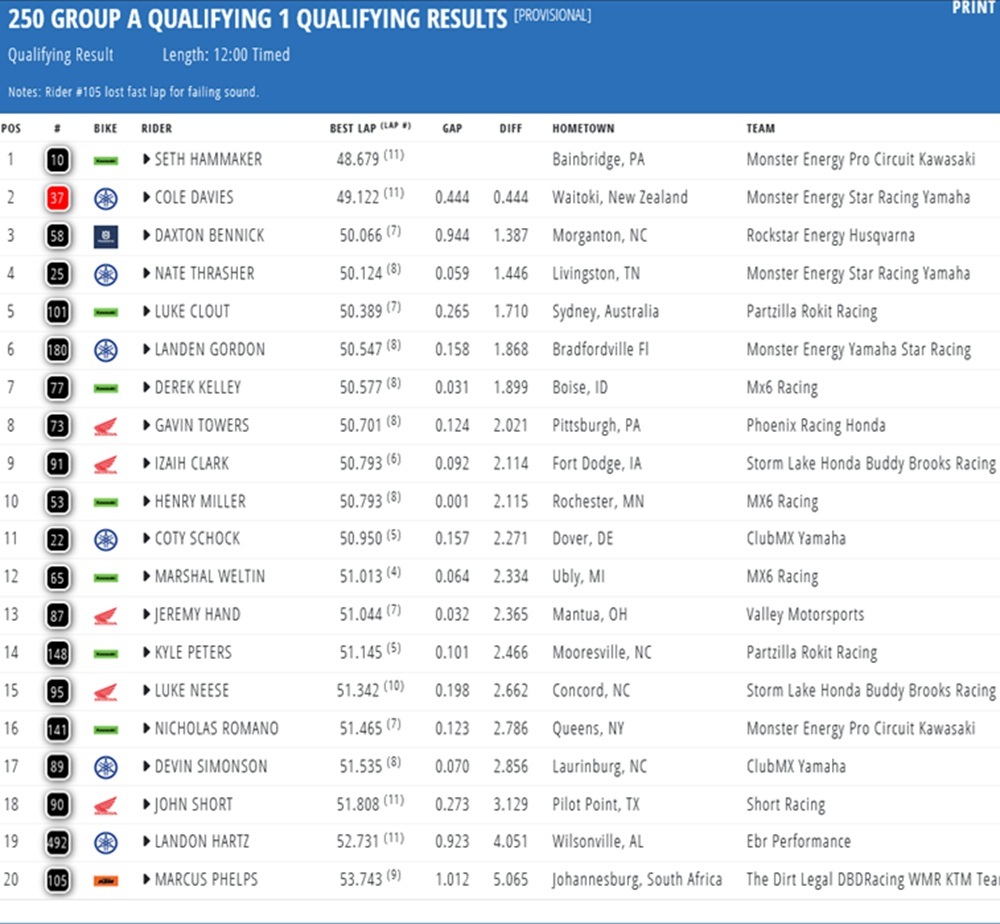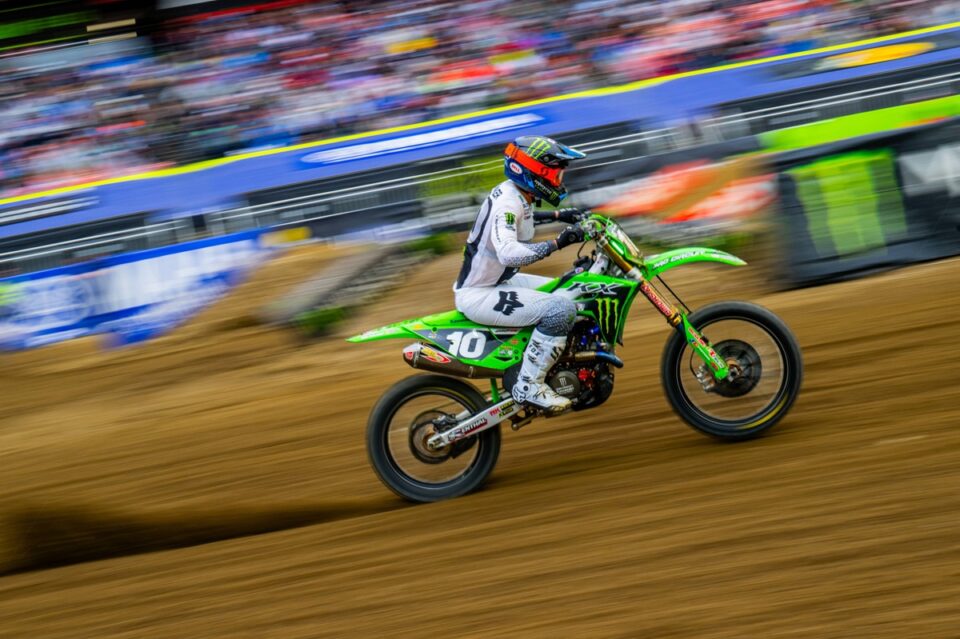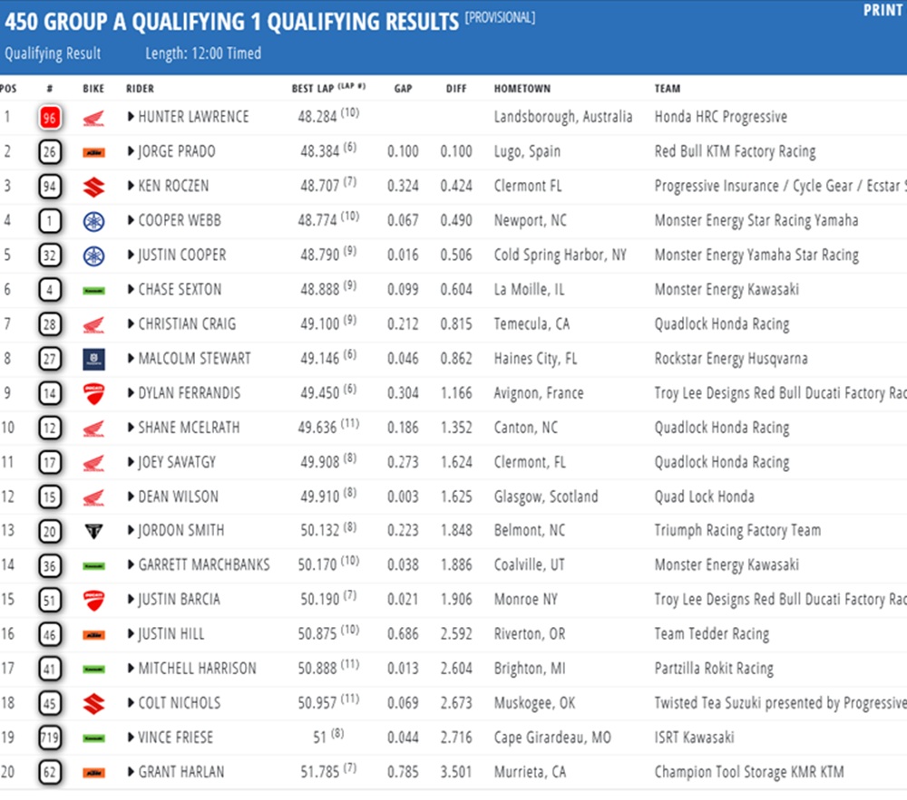 Seth Hammaker and Hunter Lawrence set the fastest times in the first qualifying session of the Supercross in Philadelphia. Jorge Prado was second fastest in the 450 class, ahead of Ken Roczen!