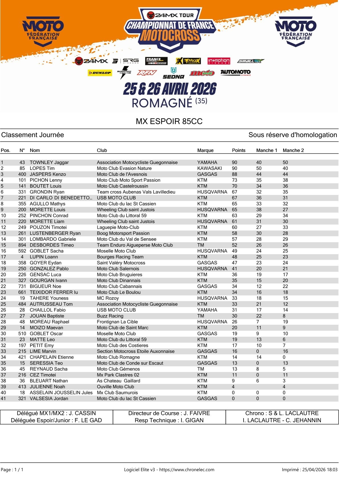 The third round of the French 24MX Tour championship did not disappoint. After an intense first day, Yaggar Townley (3/1) took the win in the talent class, ahead of Tim Lopes (1/3) and Kenzo Jaspers (2/2). Next stop: Vesoul next Saturday for round #4.