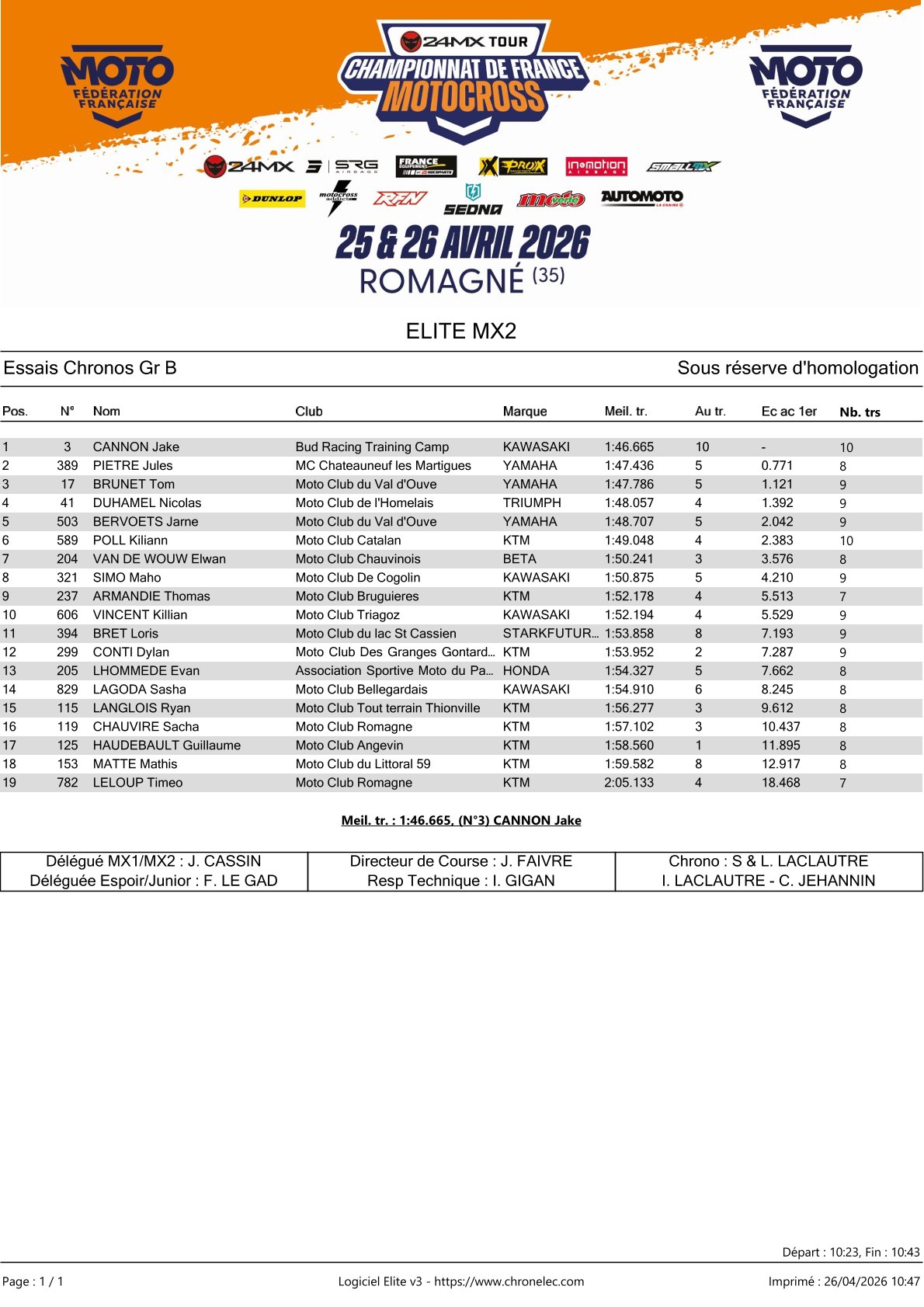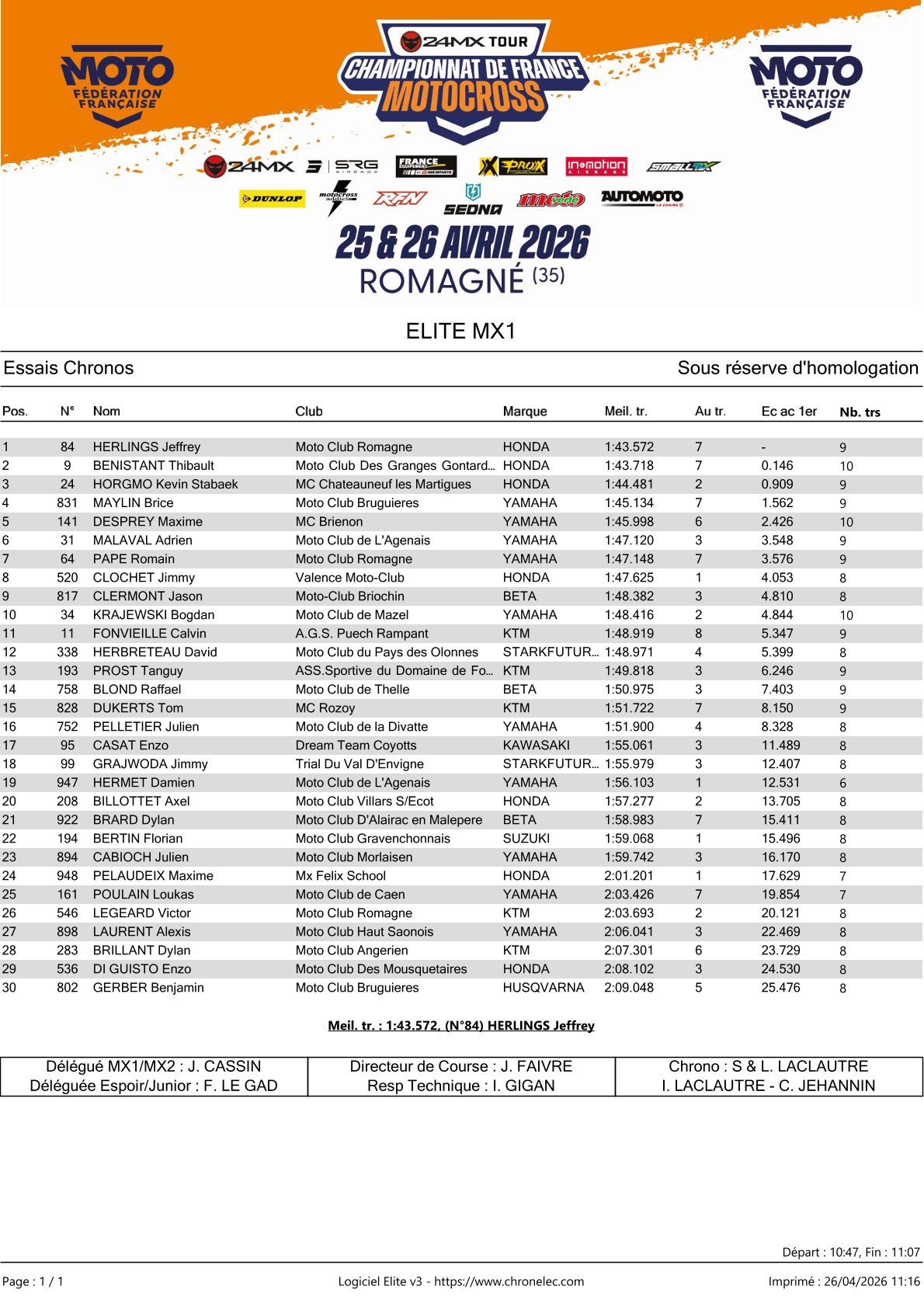 Jeffrey Herlings set the fastest time in qualifying for the French Championship in Romagné. He was just a fraction quicker than Thibault Benistant, while Kevin Horgmo secured third fastest ahead of Brice Maylin and Maxime Desprey.