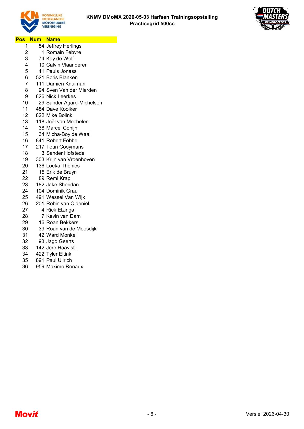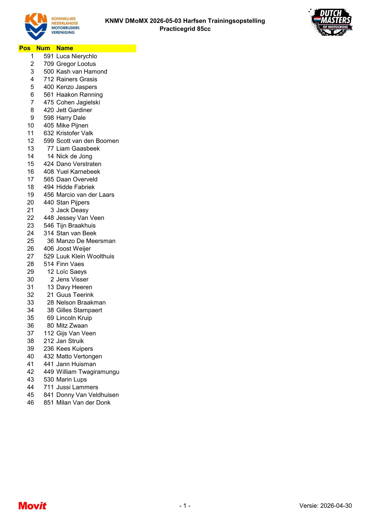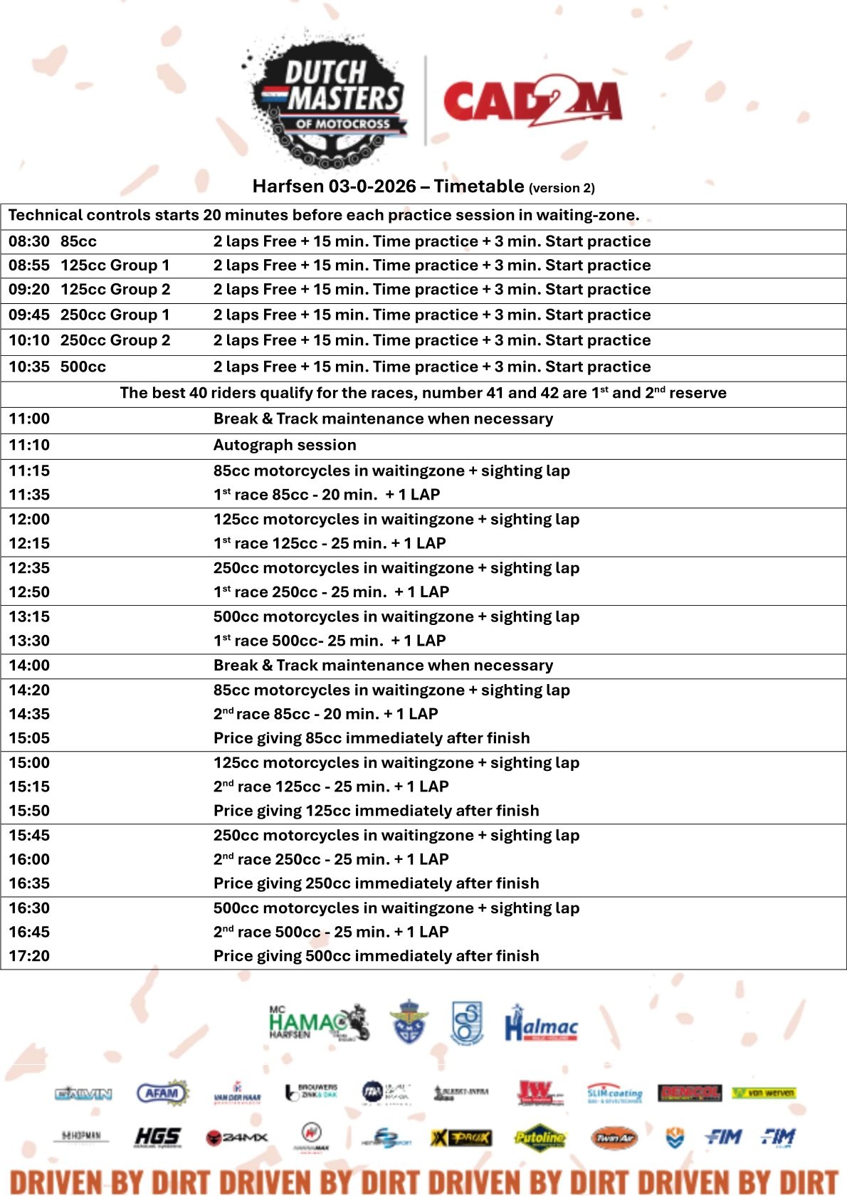 Dutch Masters Harfsen – Entry Lists and Schedule April 30, 2026April 30, 2026 This coming Sunday, the second race of the Dutch Masters of Motocross will take place in Harfsen. You can see who will be at the starting line in the participant lists below. Photocredits – Full Spectrum Media